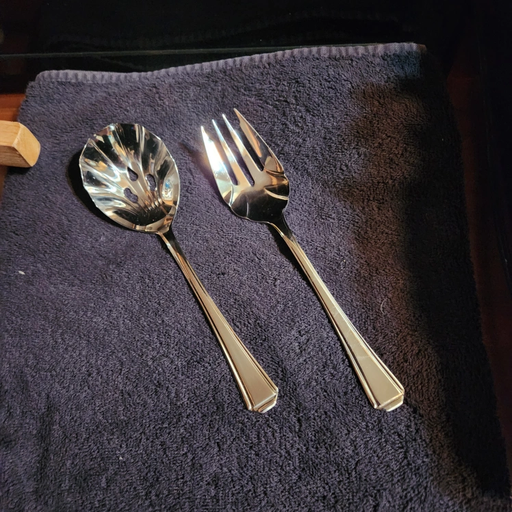 Offering a salad serving set, including a spoon and fork. They're in great condition and ready to serve up your favourite salads!