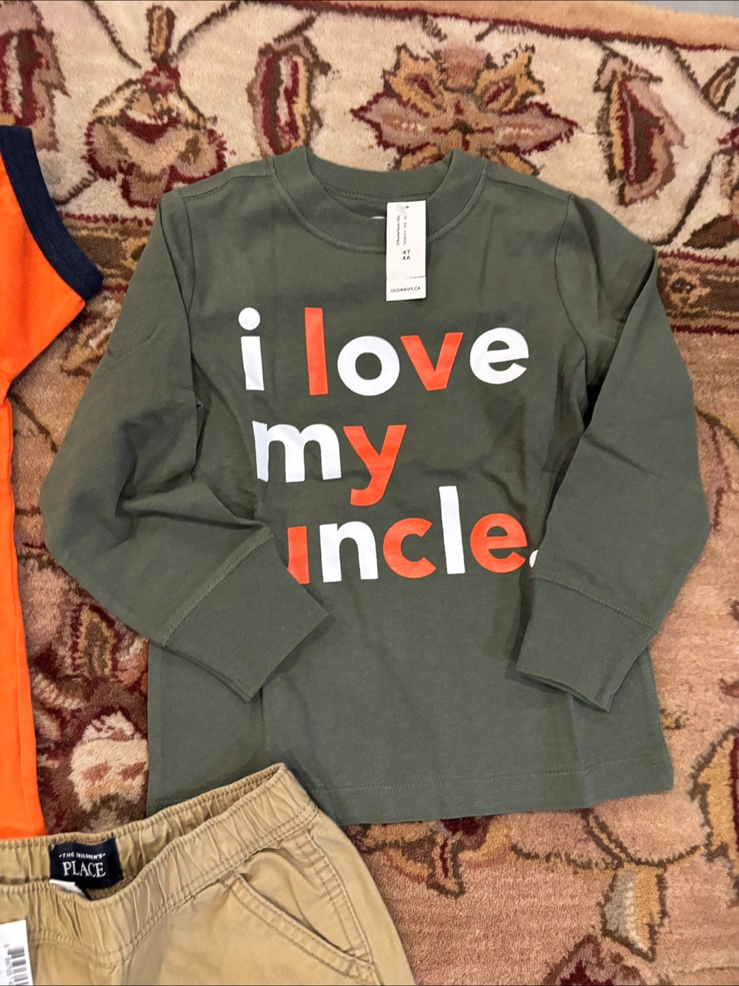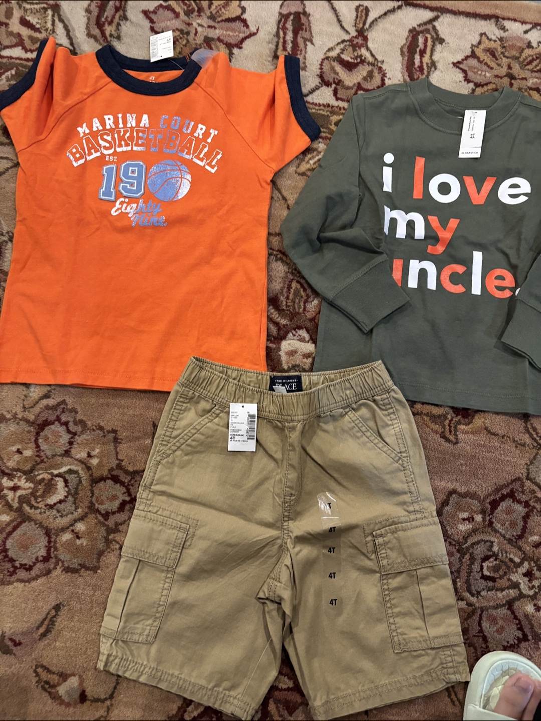 This new three-piece boy's clothing set, size 4T, includes a vibrant orange basketball tee, an 'I love my uncle' long-sleeve shirt, and khaki cargo shorts, perfect for a stylish and comfortable outfit.