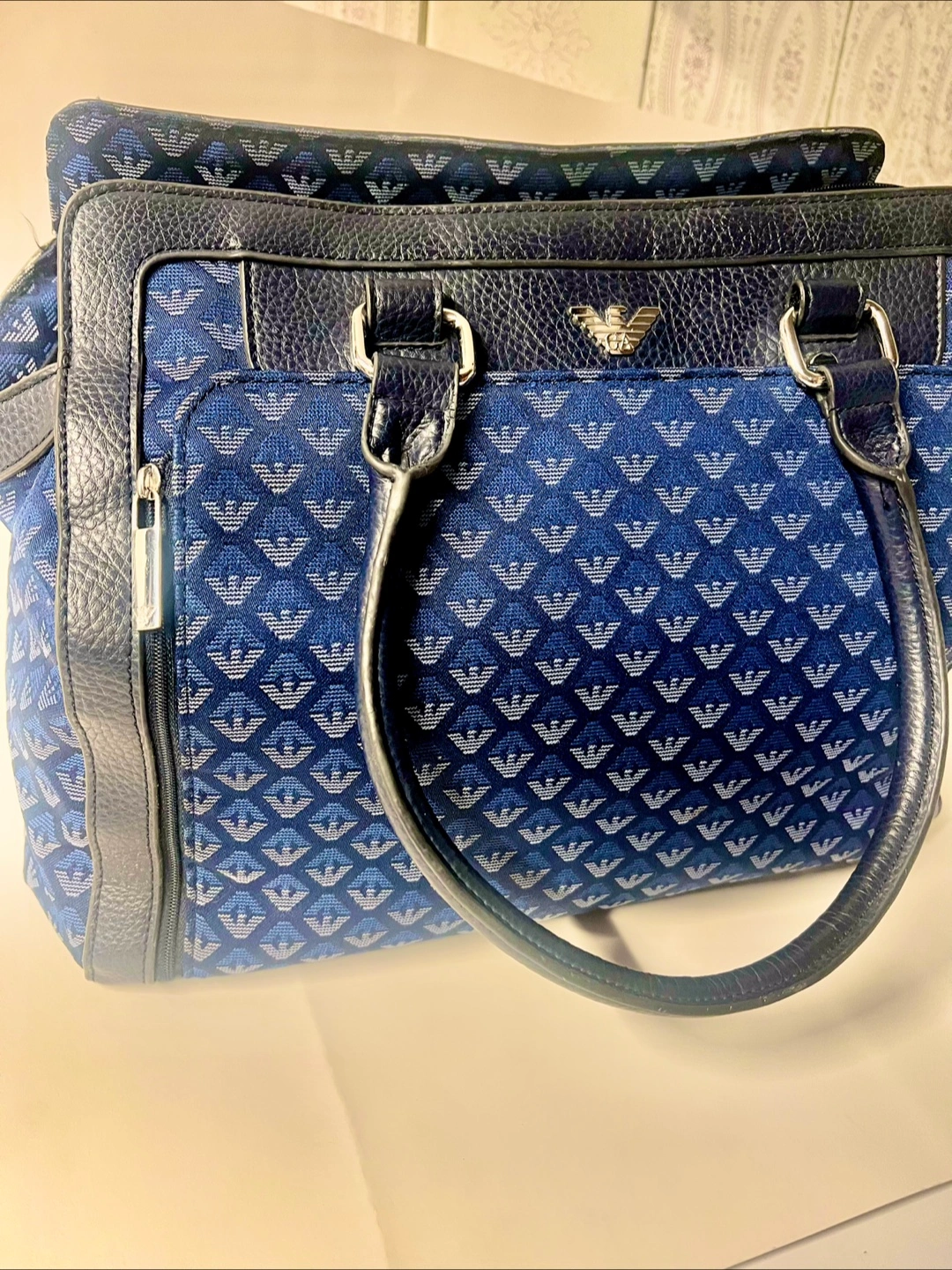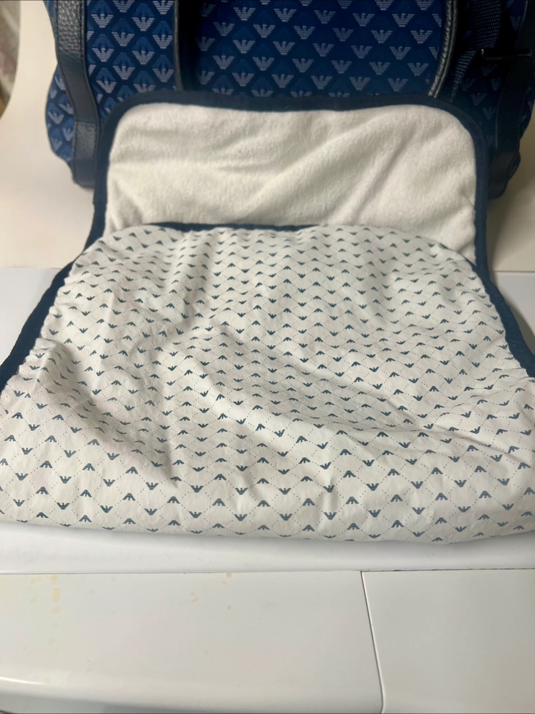 Here's an Emporio Armani diaper bag in a stylish blue pattern! It features black leather trim and handles. Inside, there's a changing pad with a cute white and blue dotted pattern. Perfect for keeping all your baby essentials organized while on the go