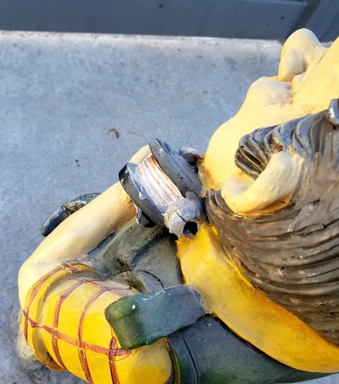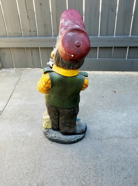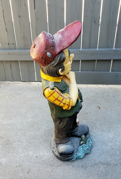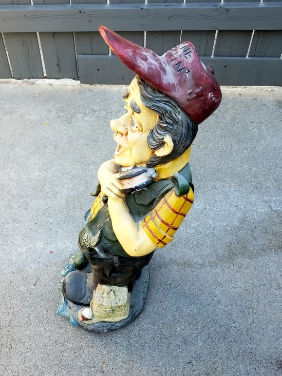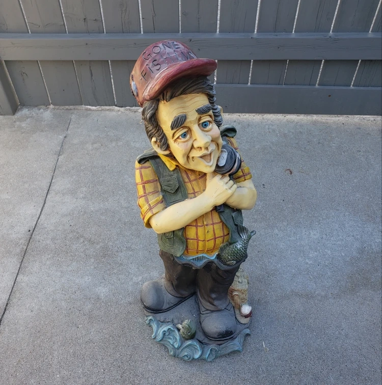 This is a charming fisherman garden gnome statue, perfect for adding a touch of whimsy to your outdoor space. He's wearing a hat that says "Gone Fishing" and holding a fishing rod. He has a few minor signs of wear and missing the rod ,but he's still in good shape and ready to bring some character to your garden or patio. $50