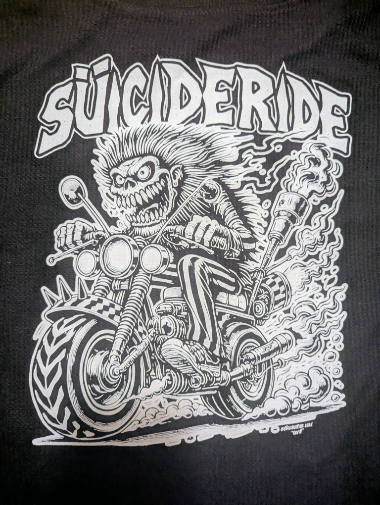 Turn the throttle and burn rubber with this hardcore Suicideride biker long sleeve waffle knit shirt. Featuring a savage, psycho-grinning rider ripping a chopper straight out of a Rat Fink nightmare, this shirt is built for riders who live fast and don’t apologize. Bold, oversized line art explodes off the black tee—flaming exhaust, gnarly wheels, and pure outlaw attitude.