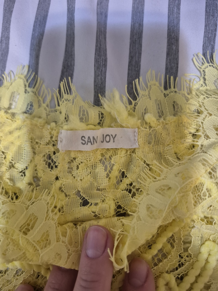 Here's a cute yellow lace top from San Joy! It's perfect for adding a pop of colour to your wardrobe. The lace detailing is really pretty and adds a touch of elegance