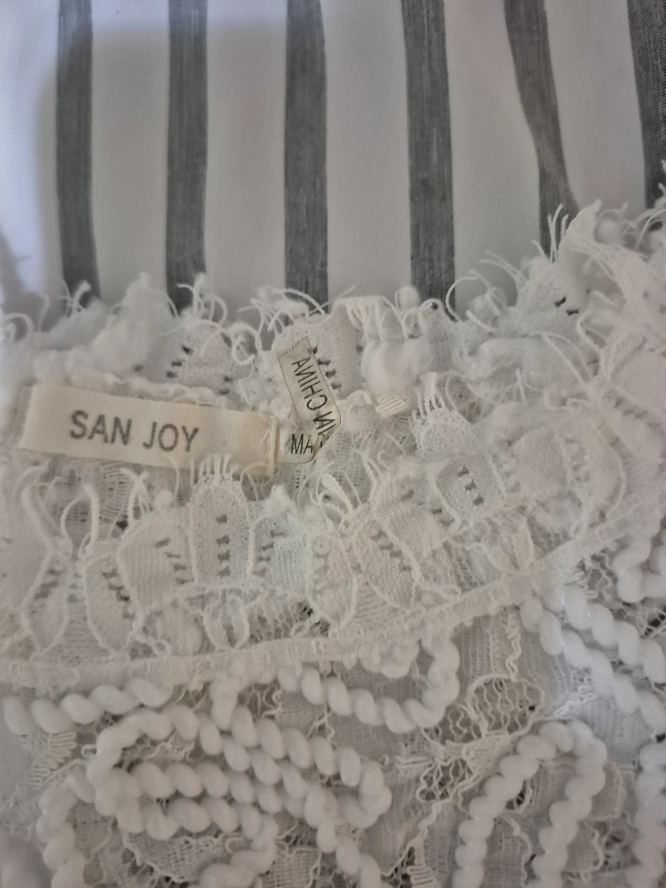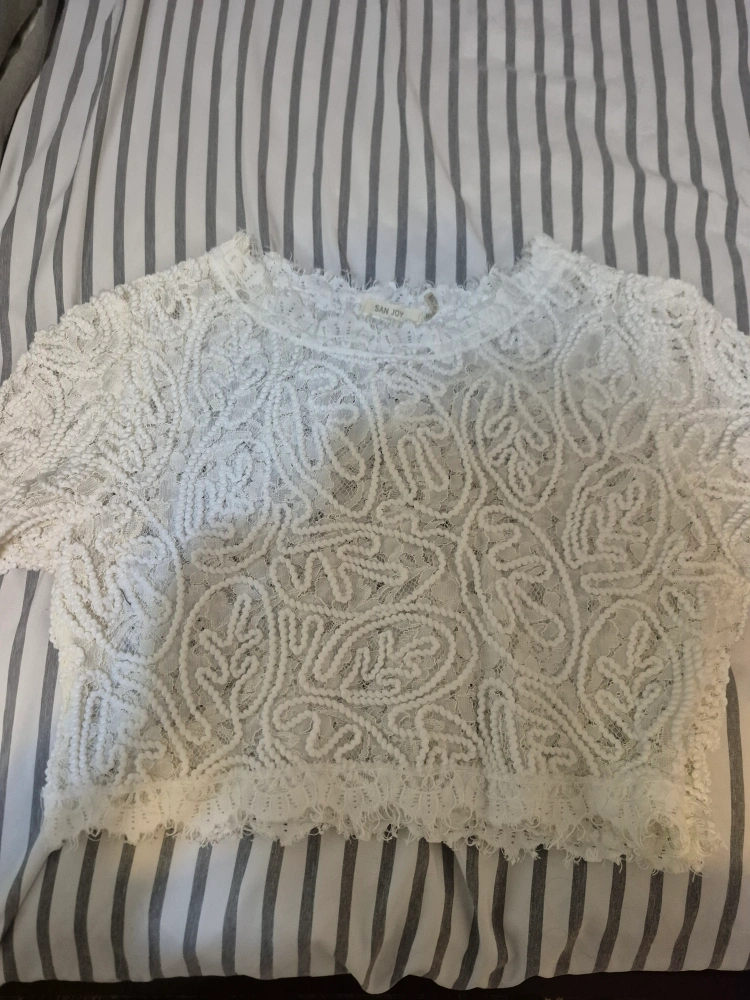 Here's a cute white lace crop top from San Joy! It's perfect for layering or wearing on its own during warmer weather