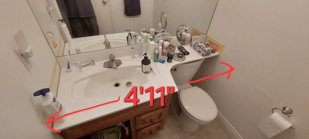 107This is a used bathroom vanity, perfect for a small bathroom renovation. The vanity features a sink, faucet, and storage cabinet. It is in good condition and ready for installation. * Cabinet Dimensions: 34 inches wide x 21 inches deep x 30 inches high countertop 4'11"length * Sink Material: Ceramic * Faucet: Chrome finish * Cavinet: wood Ready to give your bathroom a little refresh? You know what they say, if this ad is still up, then yes, this vanity is still available! Based on similar items listed on Karrot, a reasonable price for this vanity is between $100 and $200. I've priced it at the higher end due to its good condition.