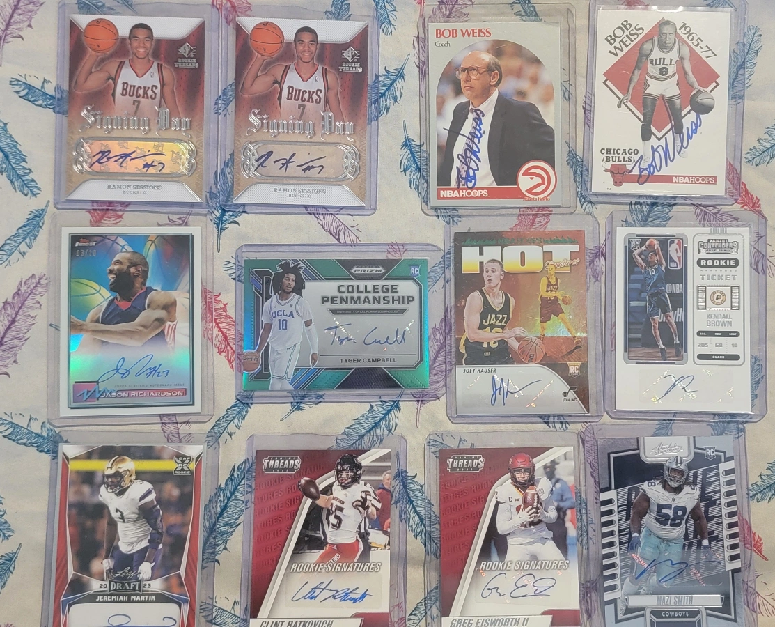 Selling a collection of autographed NBA and NFL trading cards. Includes players like Ramon Sessions, Jason Richardson, Tyger Campbell, Joey Hauser, Jeremiah Martin, Clint Ratkovich, Greg Eisworth II, and Mazi Smith. Also features coaches like Bob Weiss. Great for sports memorabilia collectors!