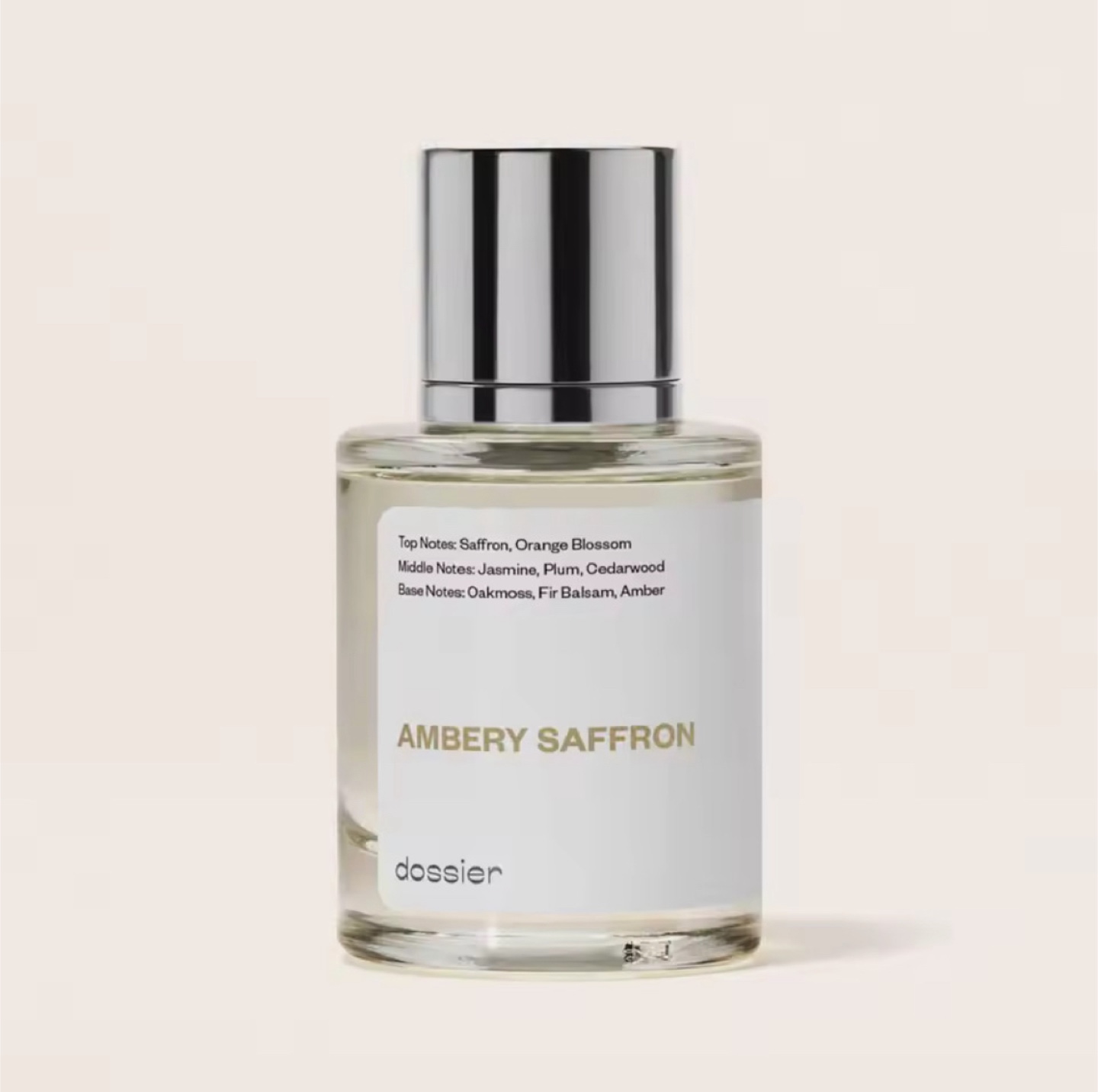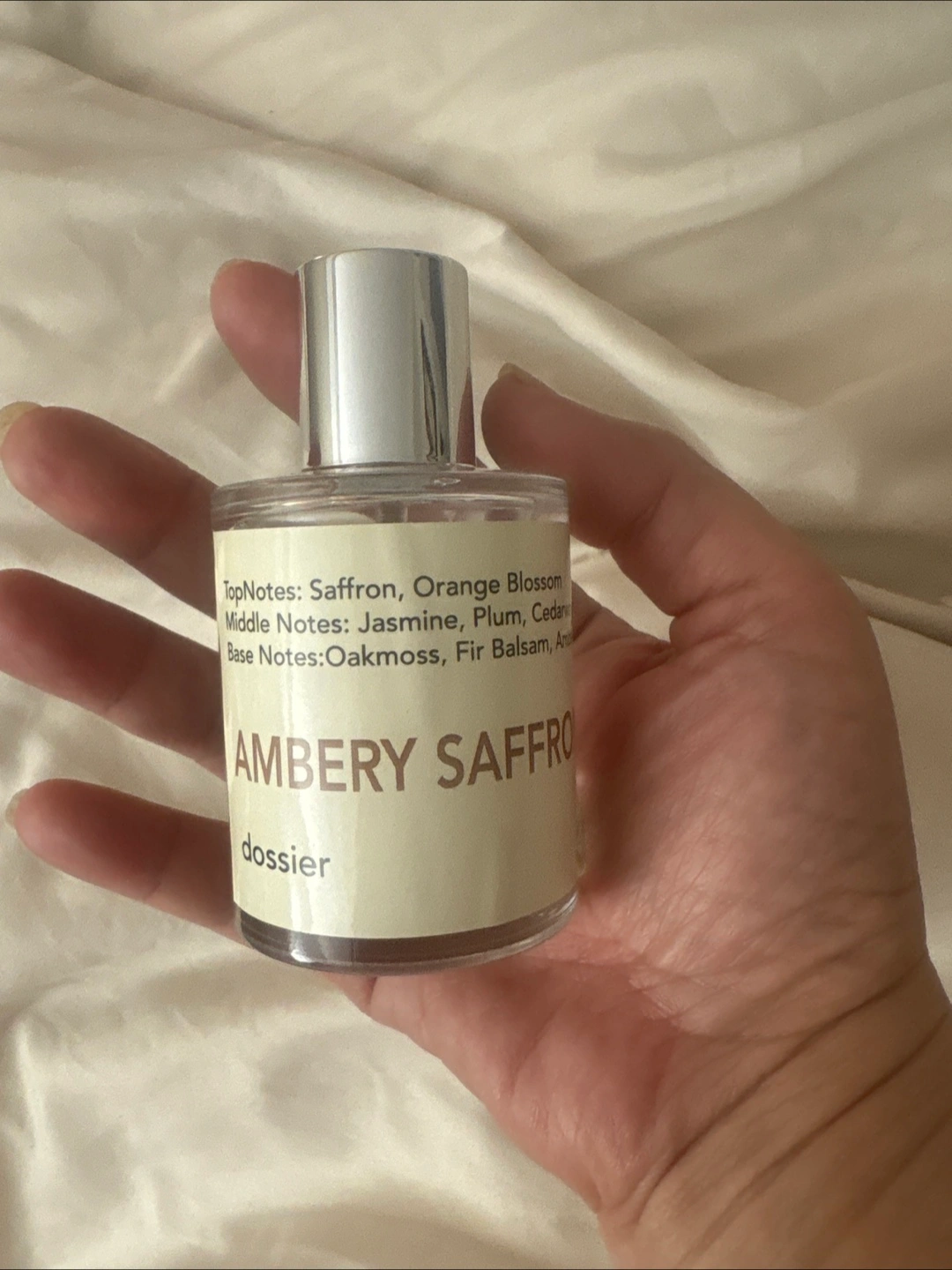 Selling a bottle of Dossier Ambery Saffron perfume! It features top notes of saffron and orange blossom, middle notes of jasmine, plum, and cedarwood, and base notes of oakmoss, fir balsam, and amber