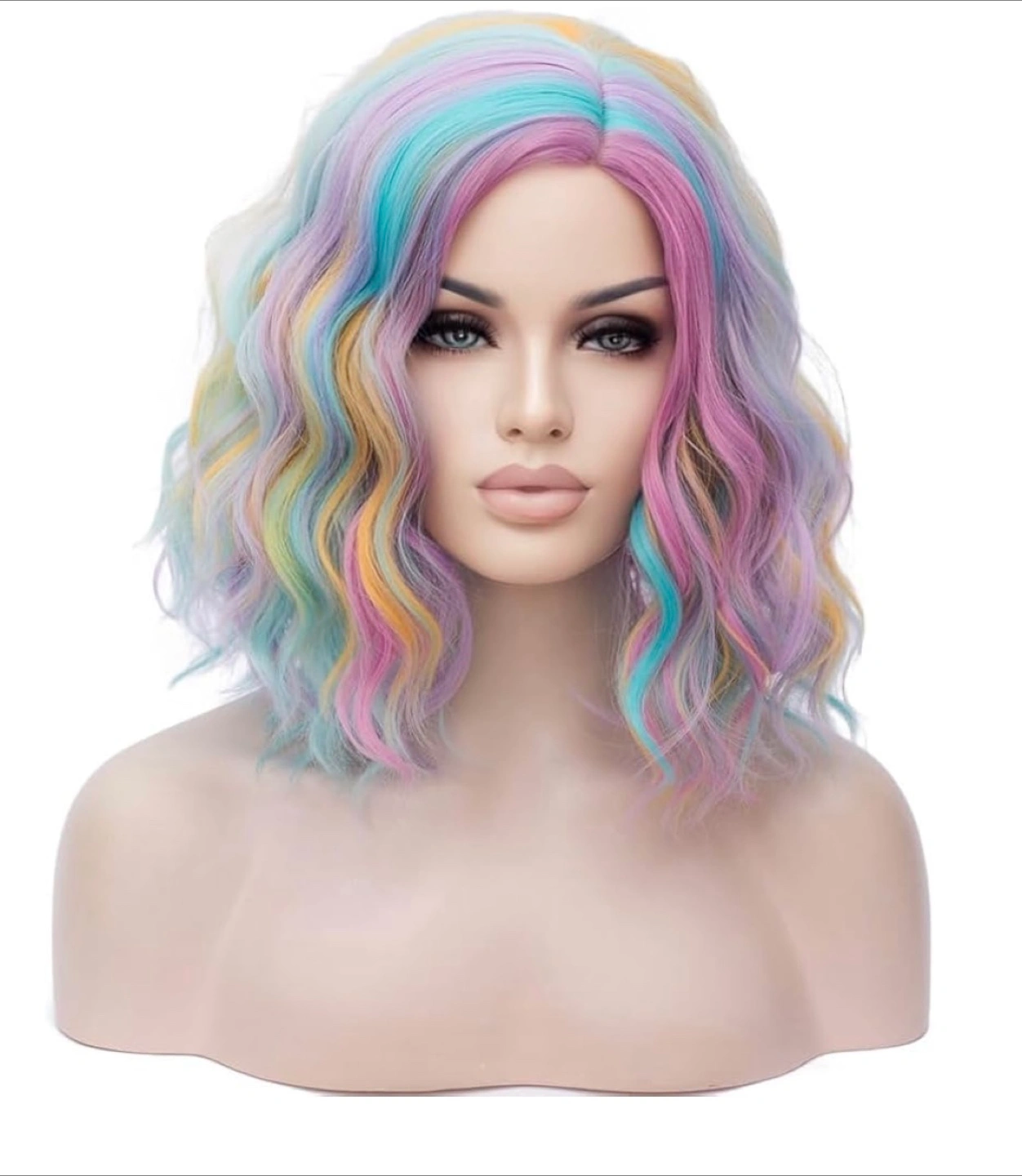 Selling a rainbow wig! It's a short bob style and features a beautiful mix of pastel colours like pink, blue, yellow, and purple. Perfect for adding a fun pop of colour to your look!