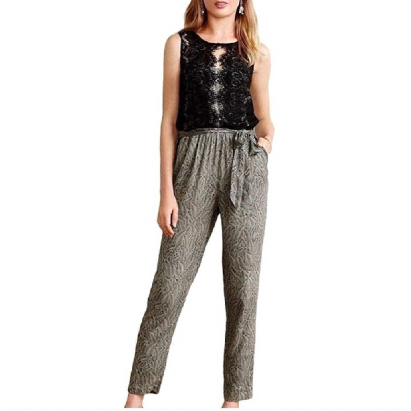 Black crocheted lace over corset style layer. Side pockets with lace trim. Side zip, back button, elastic waist, removable tie belt