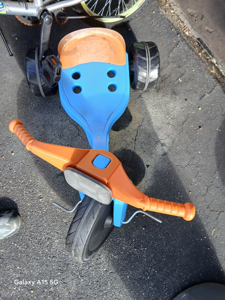 Selling a used kids' tricycle in blue and orange! It shows some signs of wear, but it's still in good condition for fun rides. Great for little ones learning to ride!