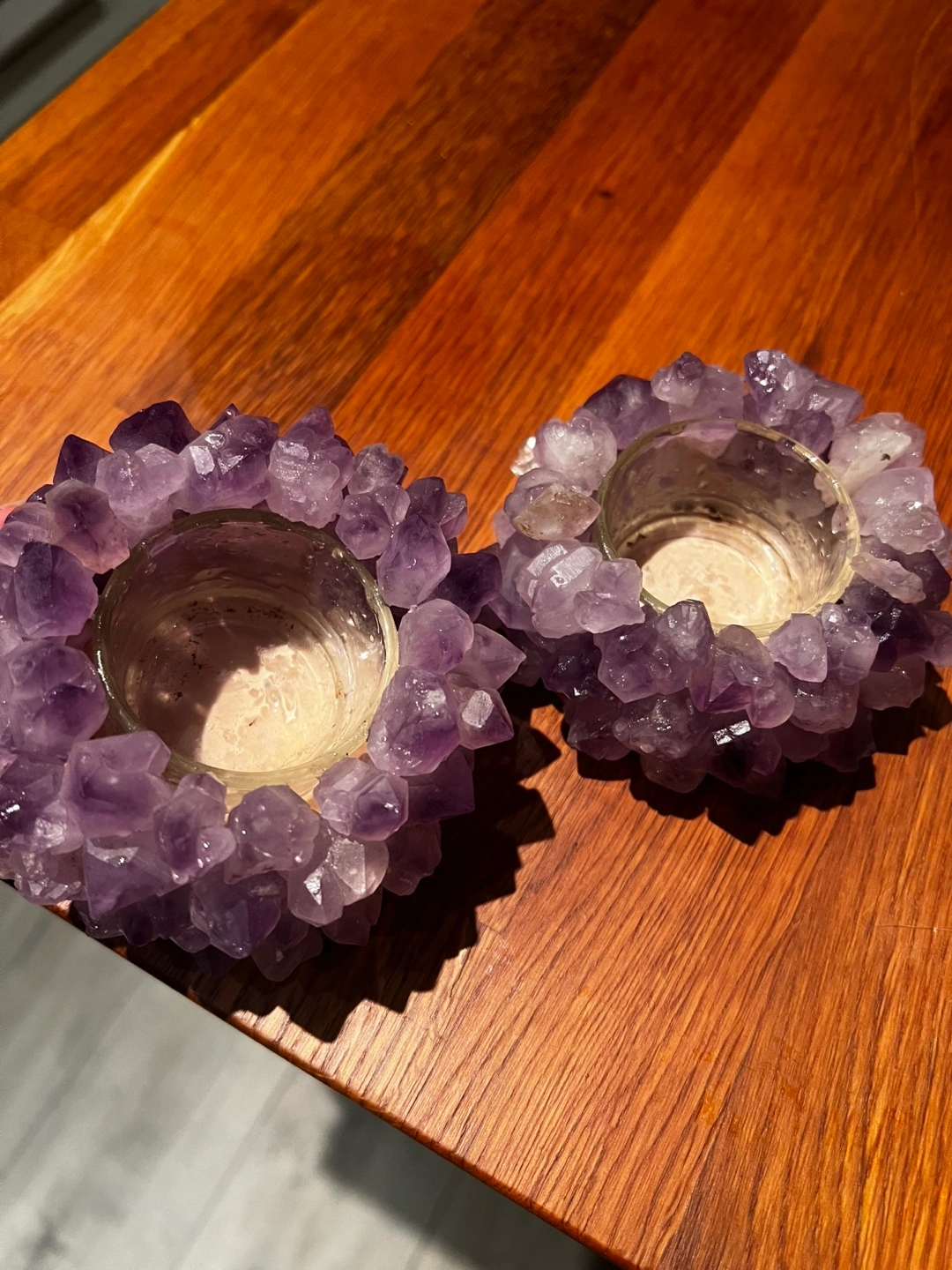 1000+Candle holder tea, light size with amethyst points. Real amethyst glued to a candle holder. Available for pick up between St. Lawrence market and distillery District.