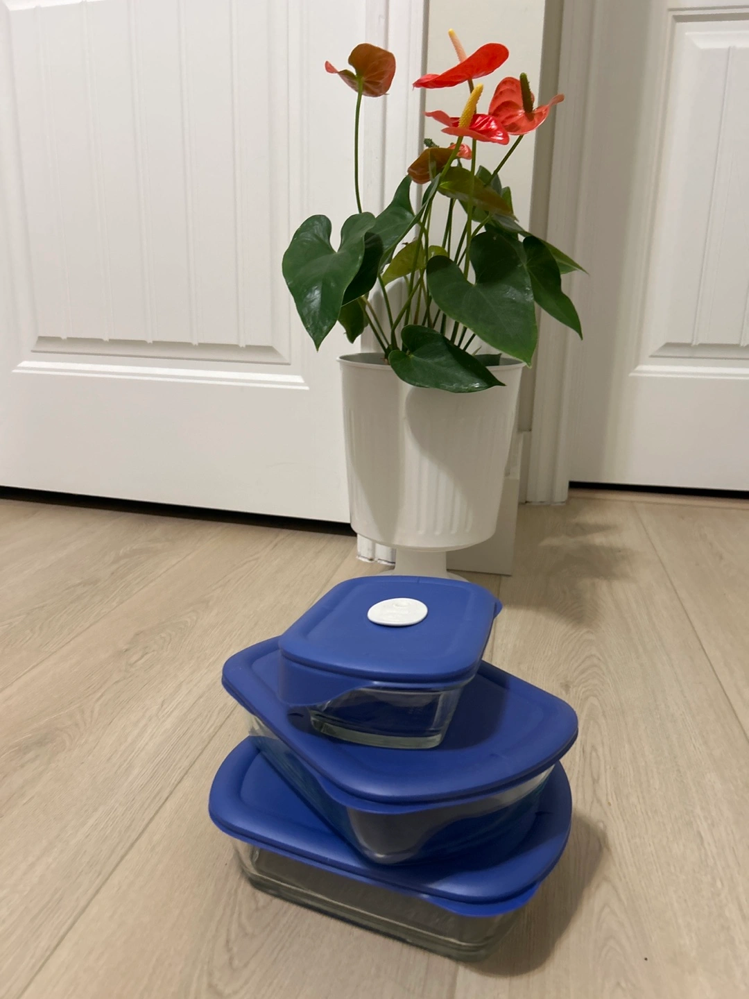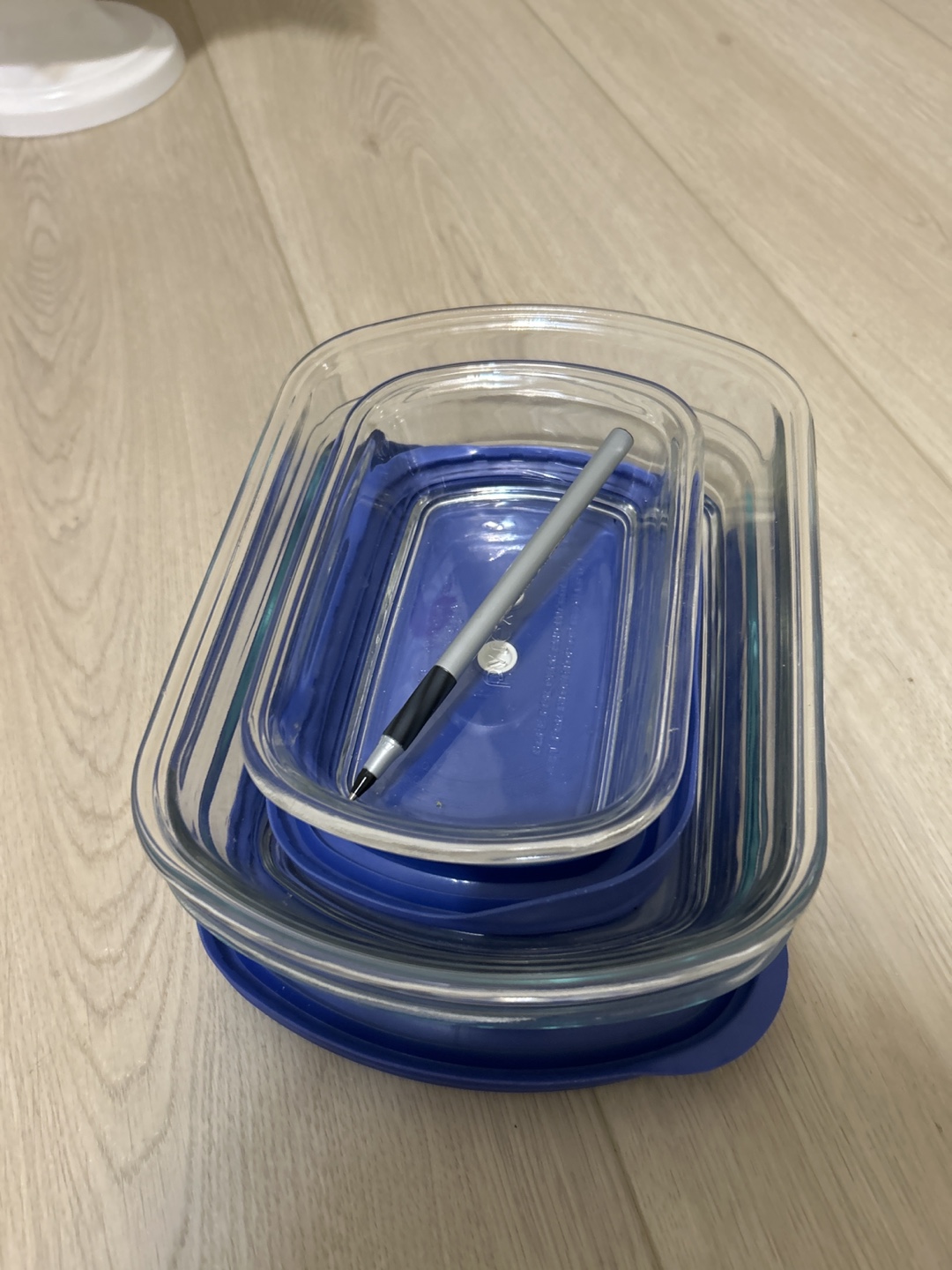 I'm selling a set of three Pyrex glass food storage containers with blue lids. They're in great shape and ready to keep your leftovers fresh! Perfect for meal prepping or storing food in the fridge. 12 for all 3