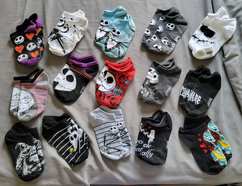 A collection of Nightmare Before Christmas socks! There are various designs and colours. All in good condition, perfect for any fan of the movie!