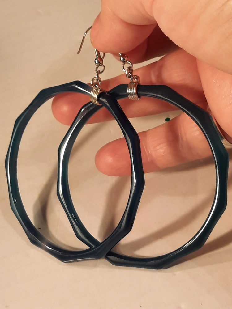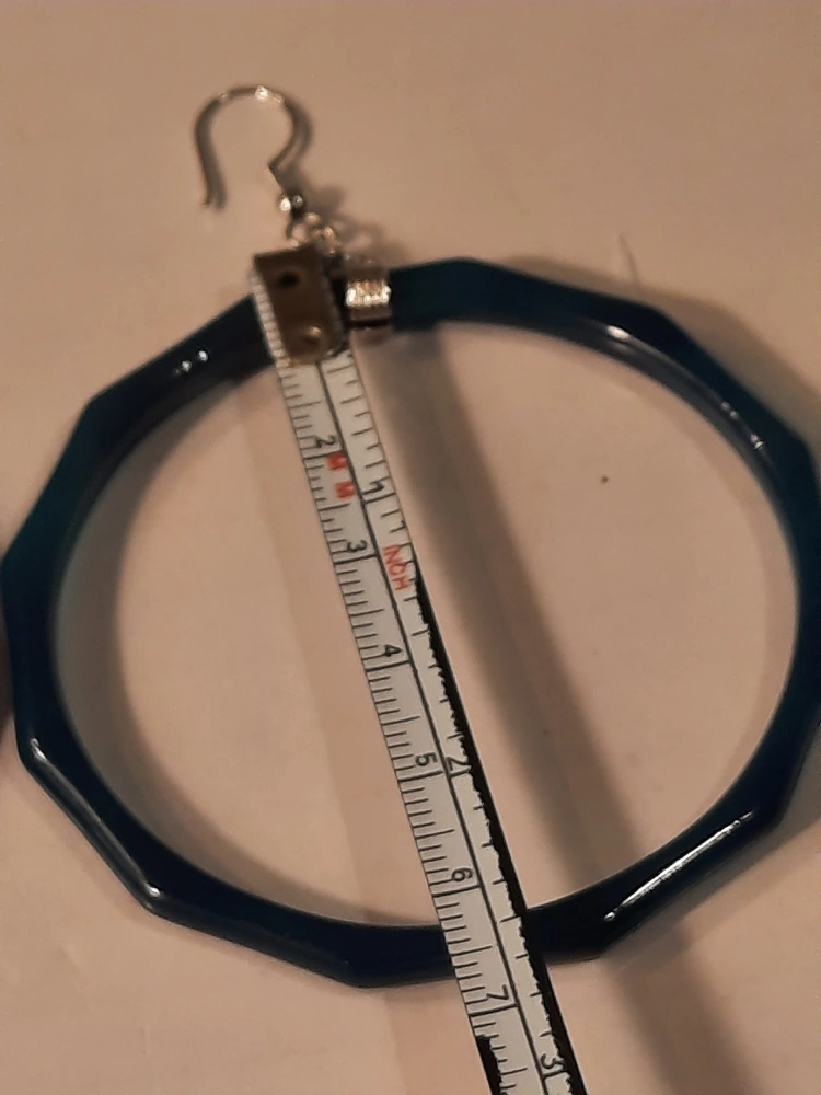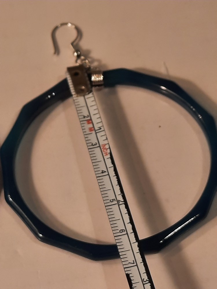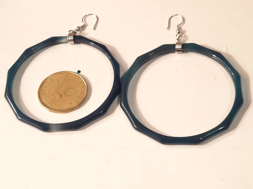 Here's a pair of blue hoop earrings jade stones dark blue for sale! They are in great condition and measure approximately 2.5 inches in diameter. Perfect for adding a touch of style to any outfit