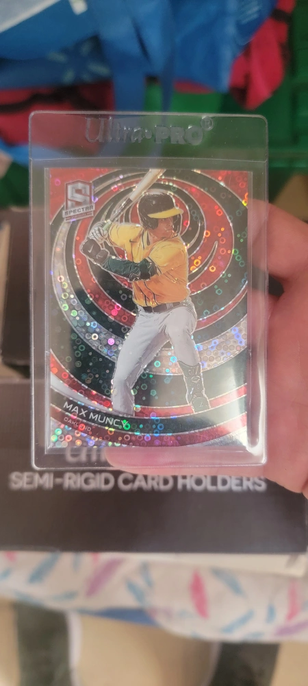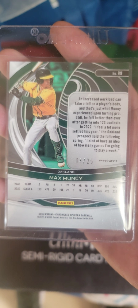 Selling a Max Muncy baseball card from the Oakland A's. It's a Spectra card from the 2023 Panini Chronicles series. The card is numbered 04/25 and features Muncy in his Oakland A's uniform from the 2022 season. A great addition to any baseball card collection!