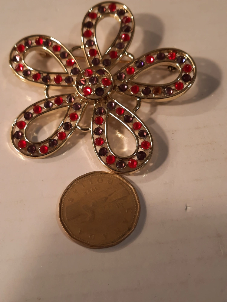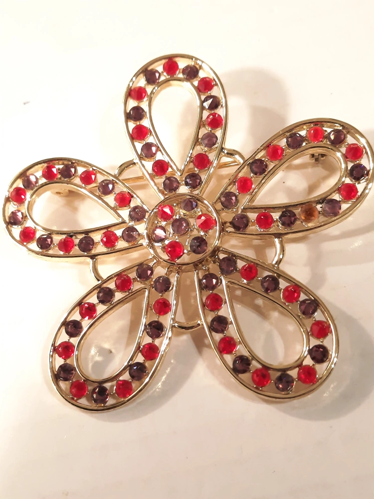 This is a lovely flower brooch with a gold-tone finish. It features red and purple rhinestones. It measures approximately 3 inches in diameter. It would make a great addition to any outfit!pick up in oshawa.