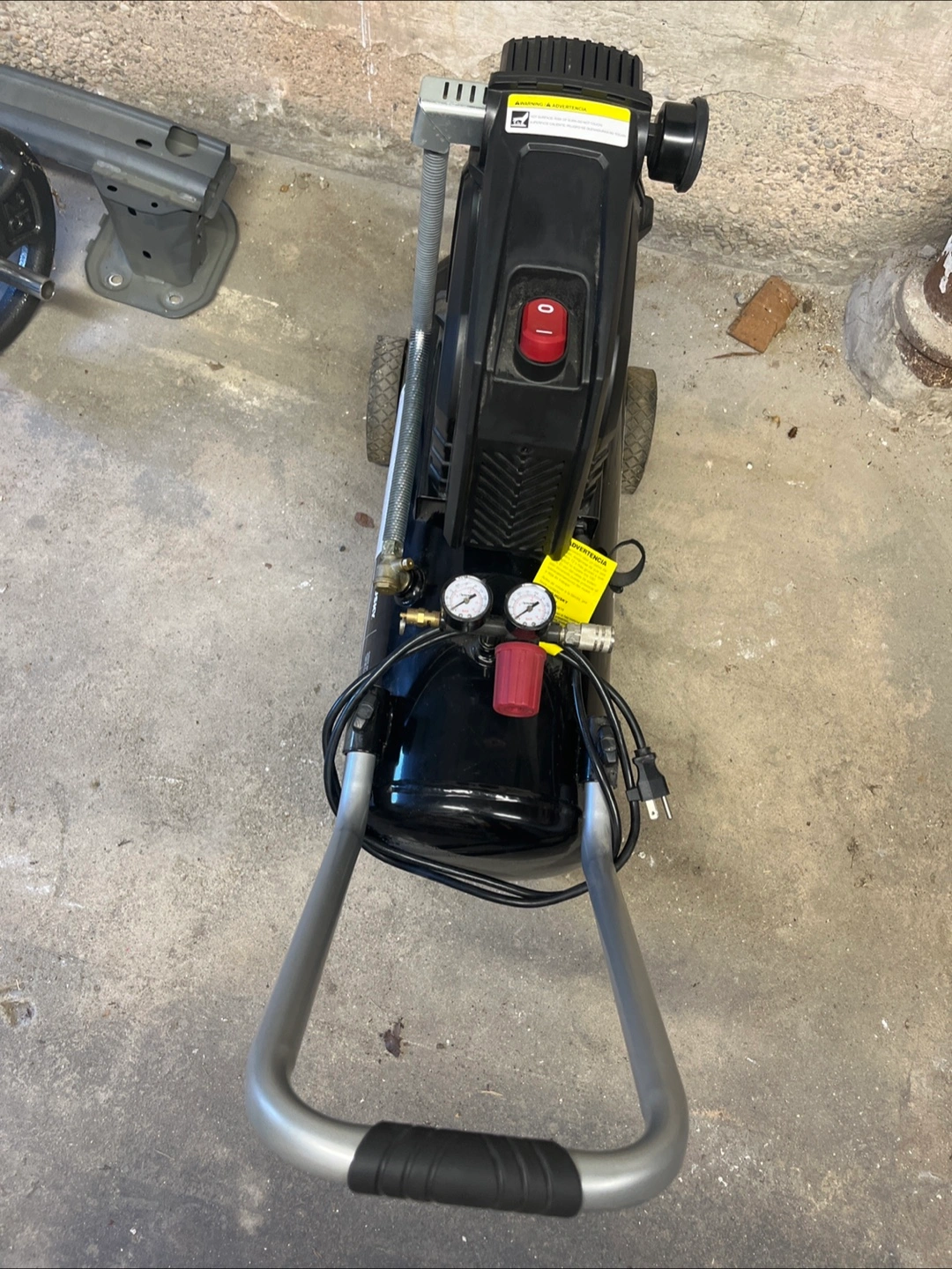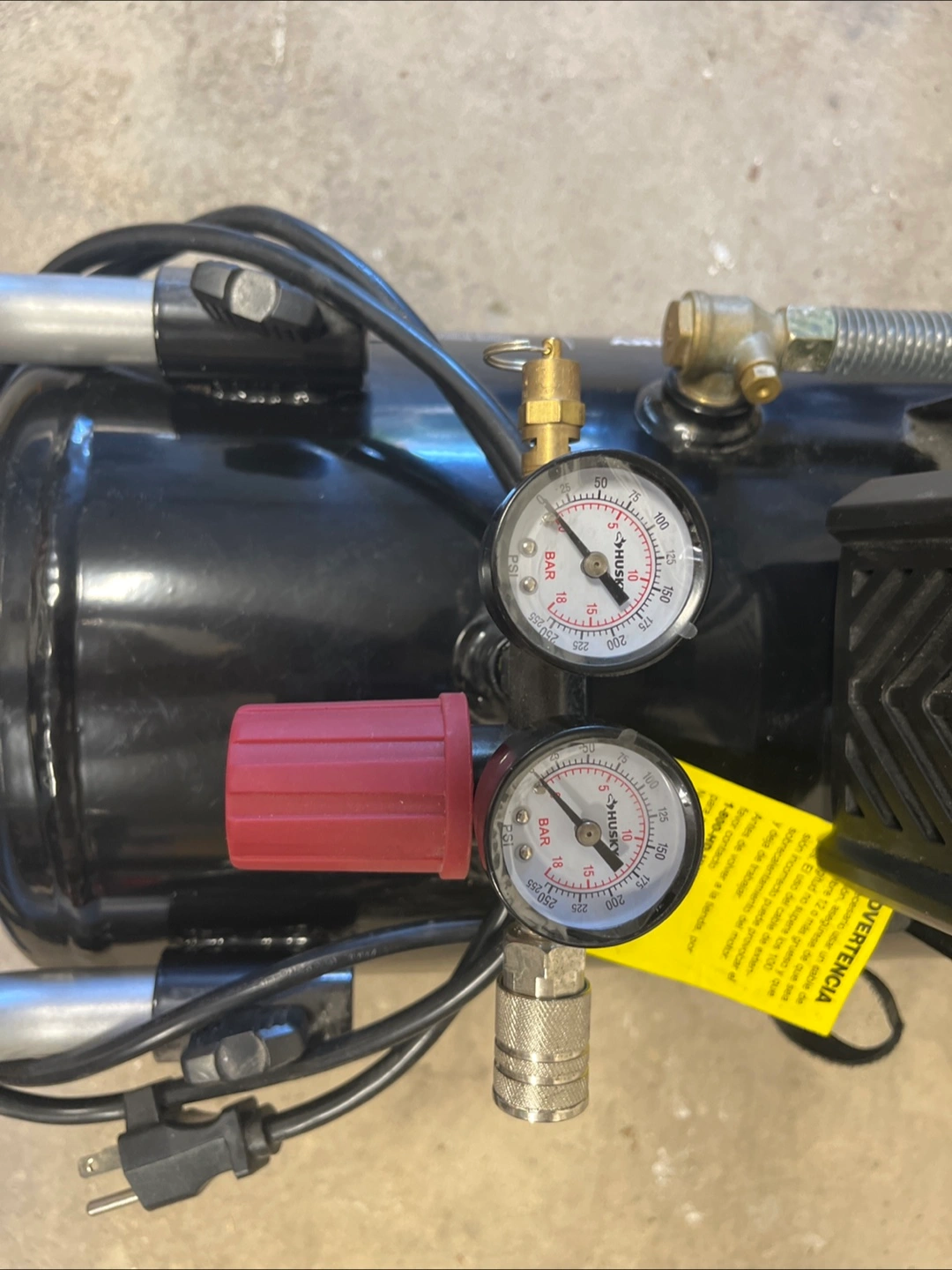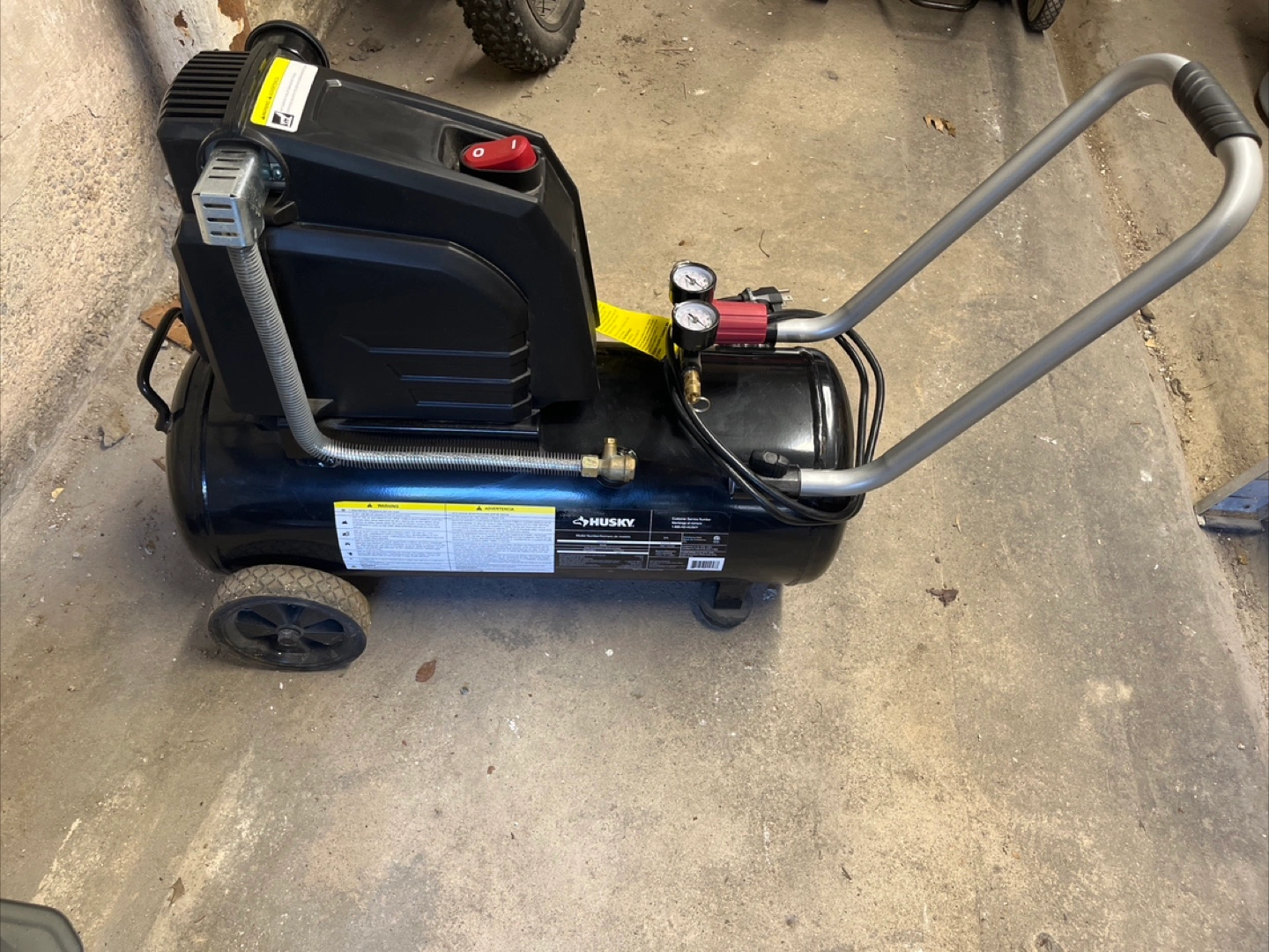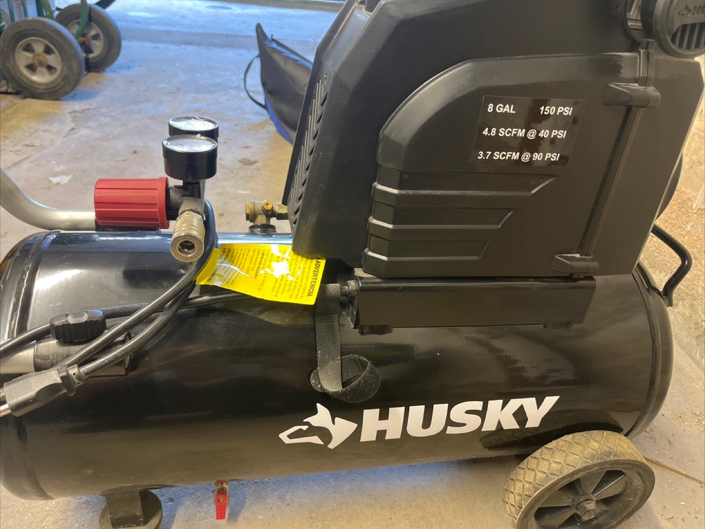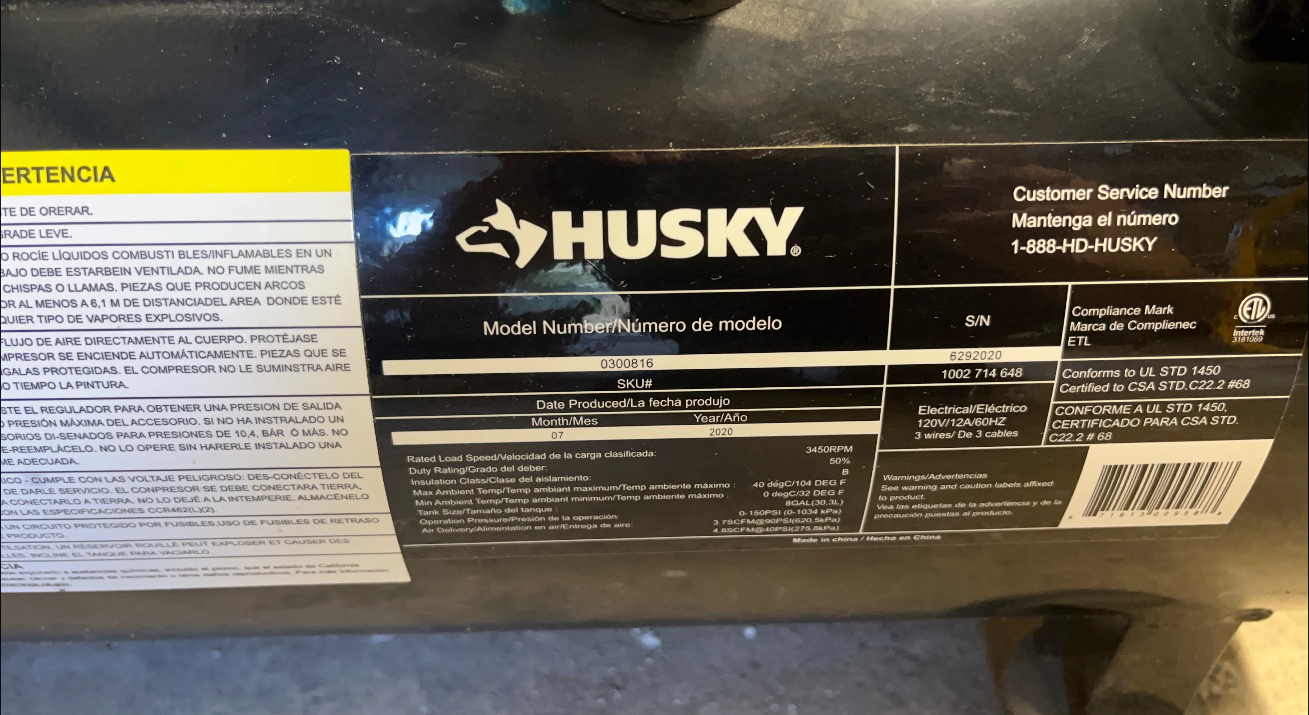 Selling a Husky air compressor, model number 1002 714 648. It's in good working condition and ready to use. Features include a 120V/12A/60Hz electrical connection and 3 wires of 3 cables.