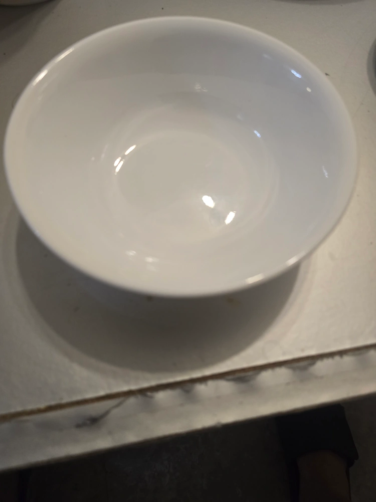 Here's a white bowl. It's perfect for cereal, soup, or snacks. It's in great shape and ready for a new home