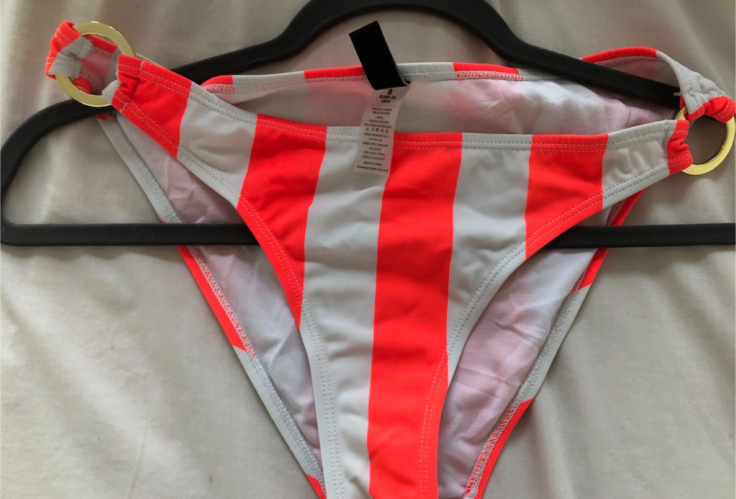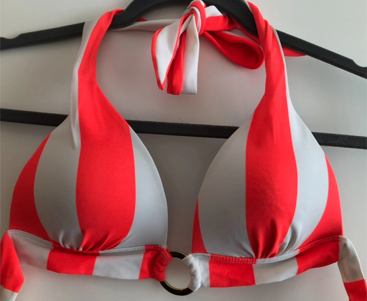 This Bikini Lab bikini is super cute for summer! It features a vibrant orange and white striped pattern.