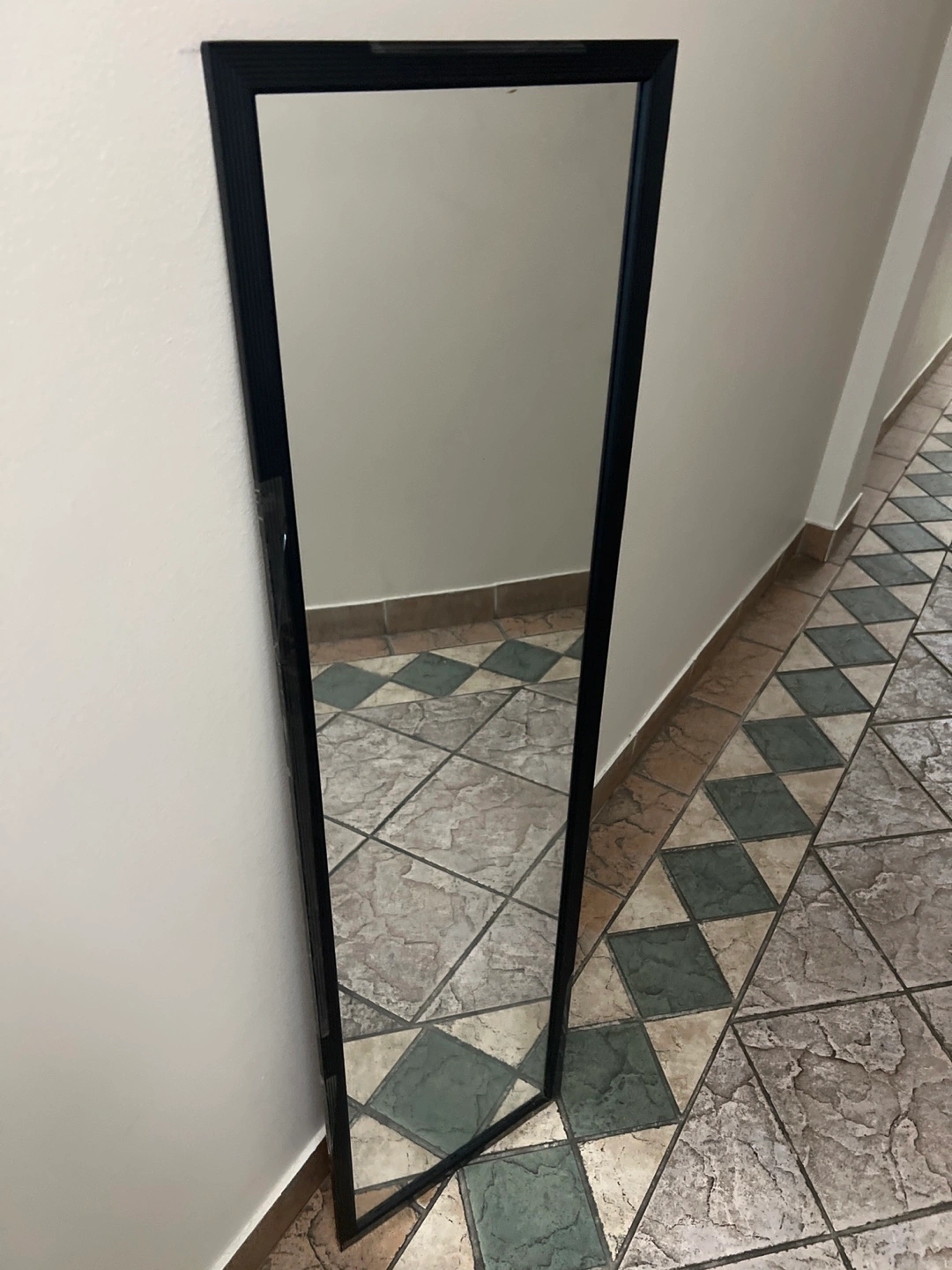 Selling a full length mirror with a black frame. It's in good condition and would look great in any room! Perfect for checking your outfit before heading out the door