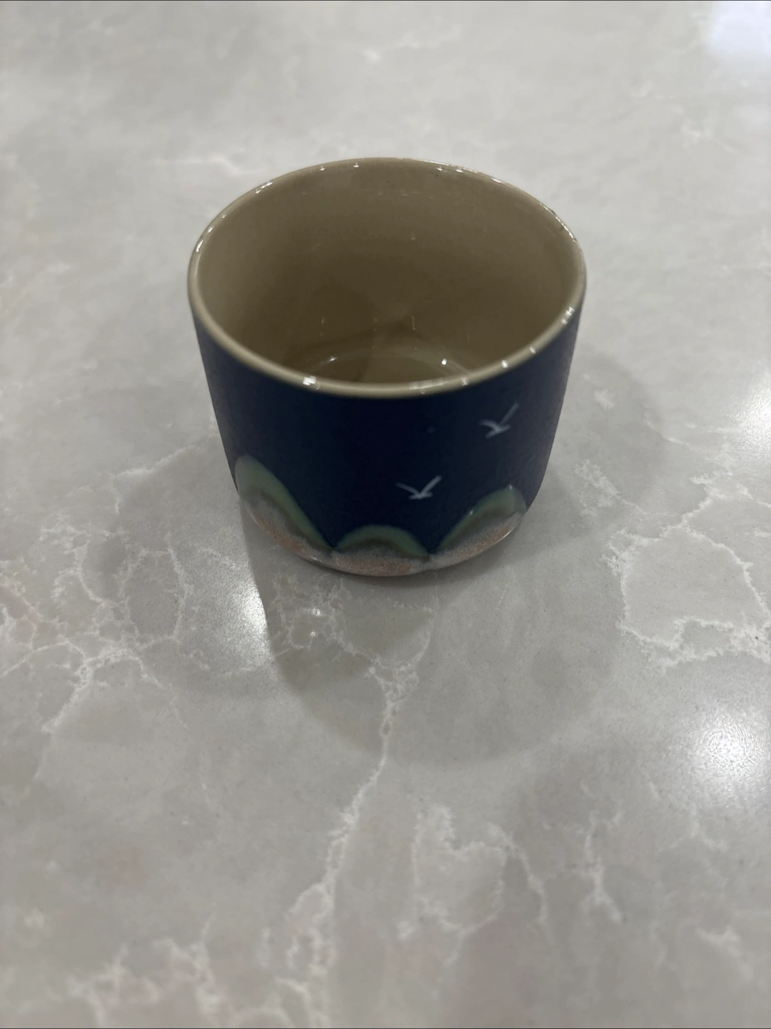 a cute ceramic cup! It has a dark blue exterior with a light beige interior. There's a charming design of hills and flying birds around the base. Perfect for a small drink or just adding a touch of whimsy to your kitchen