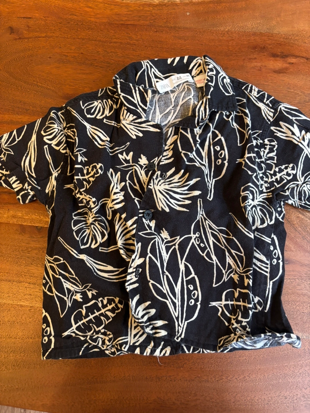 A cute Zara kids button-up shirt in size 2-3 years (CM 98). The shirt features a stylish black and white leaf pattern. It's in great condition and ready for a new home!