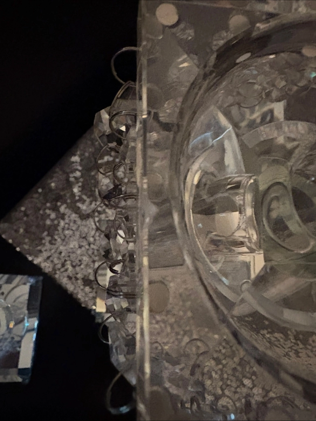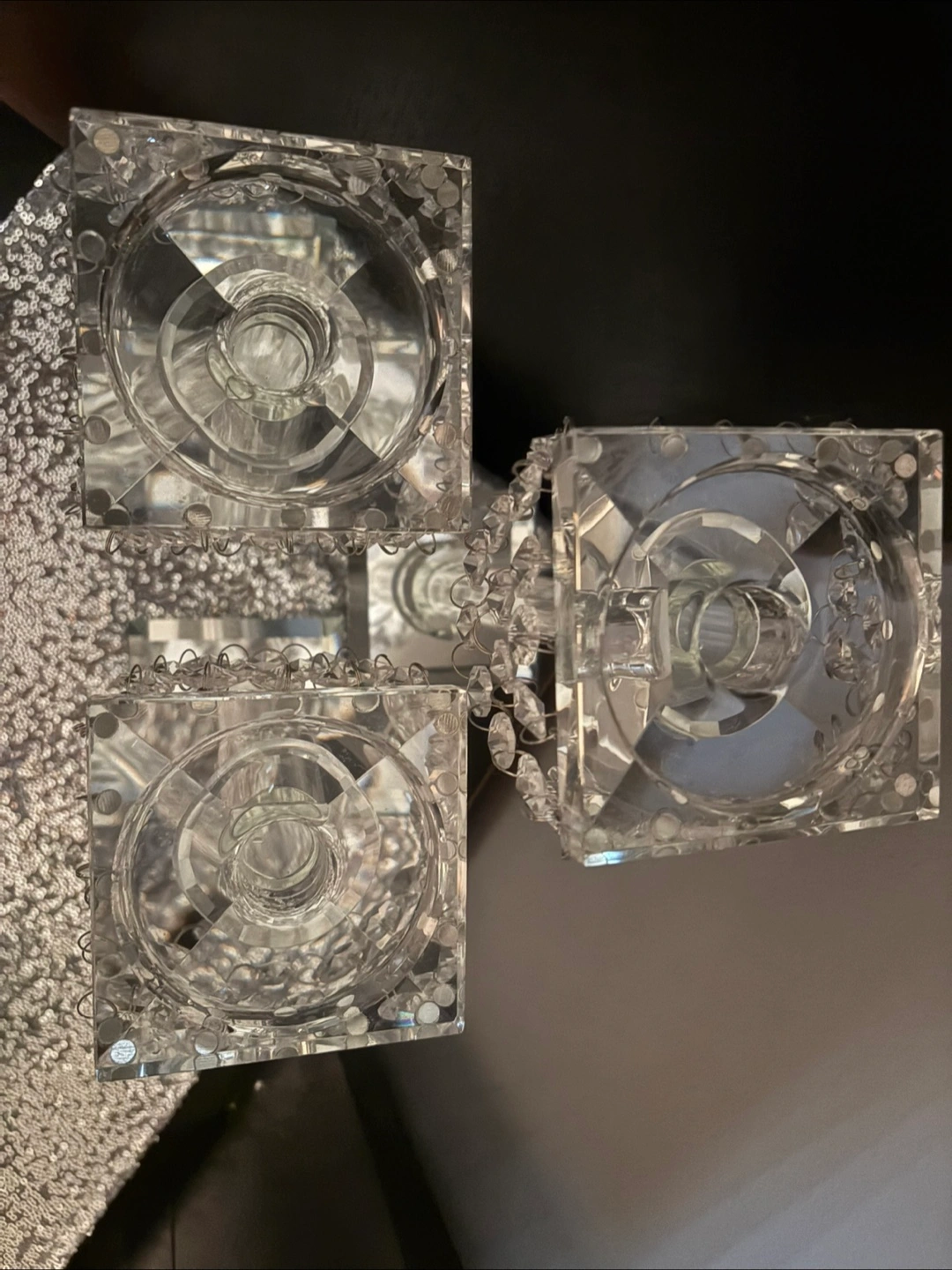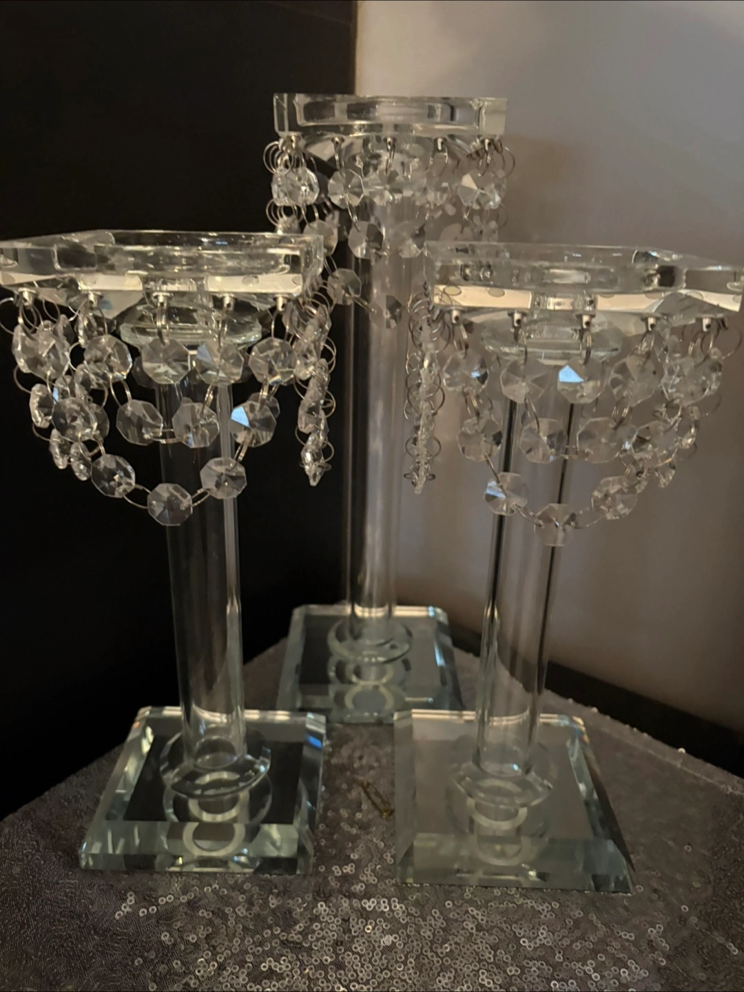 Here's a set of three crystal candle holders. They're so pretty and would look great on a dining table or mantle. They're in great condition and ready for a new home! There is a small chip (shown in picture)