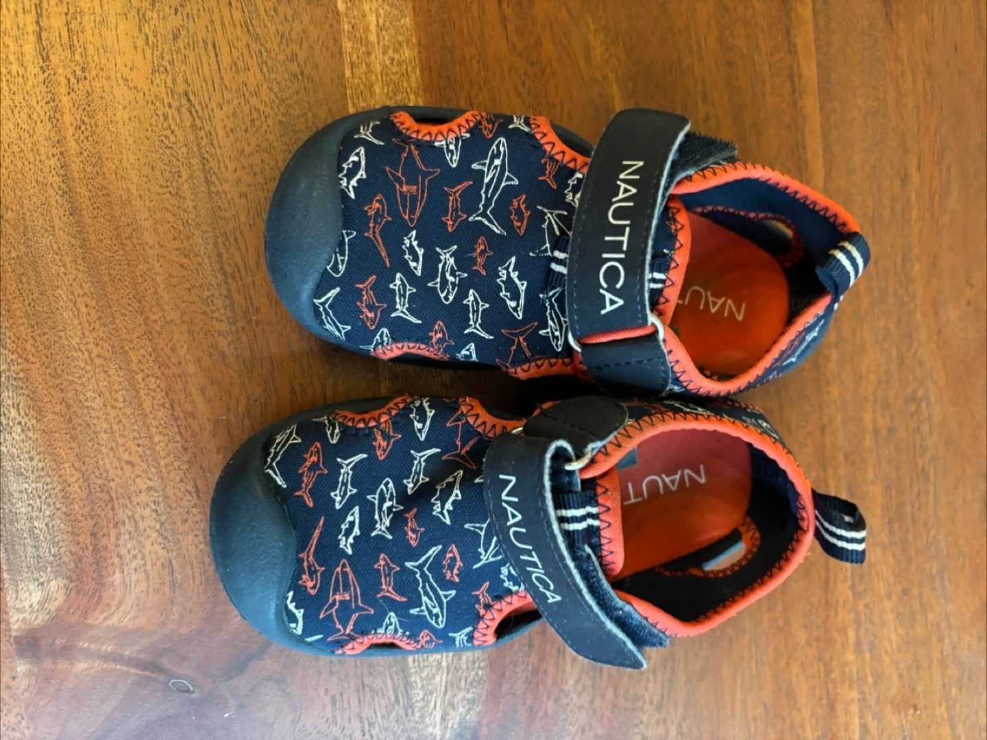 These toddler sandals from Nautica feature a fun shark print! They are in great condition and perfect for summer outings or playing at the splash pad. The sandals have a hook-and-loop closure for easy on and off.