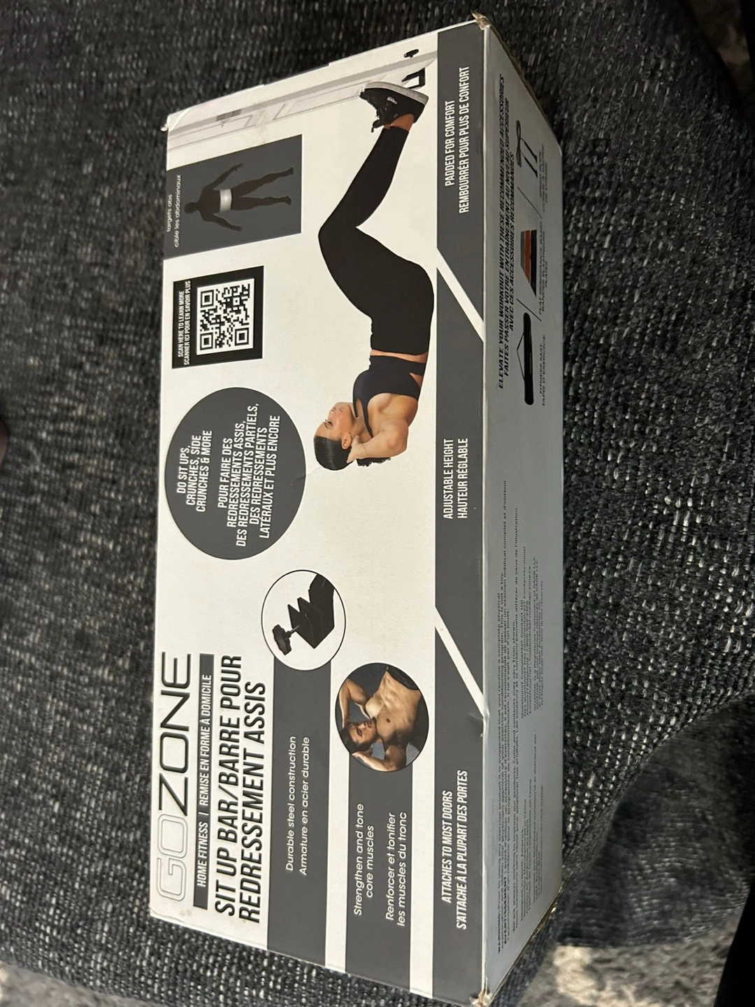 Selling a GoZone Sit Up Bar for home fitness! This is great for core workouts and strengthening your muscles. It attaches to most doors and features durable steel construction. The box is included, ready for a new home gym!