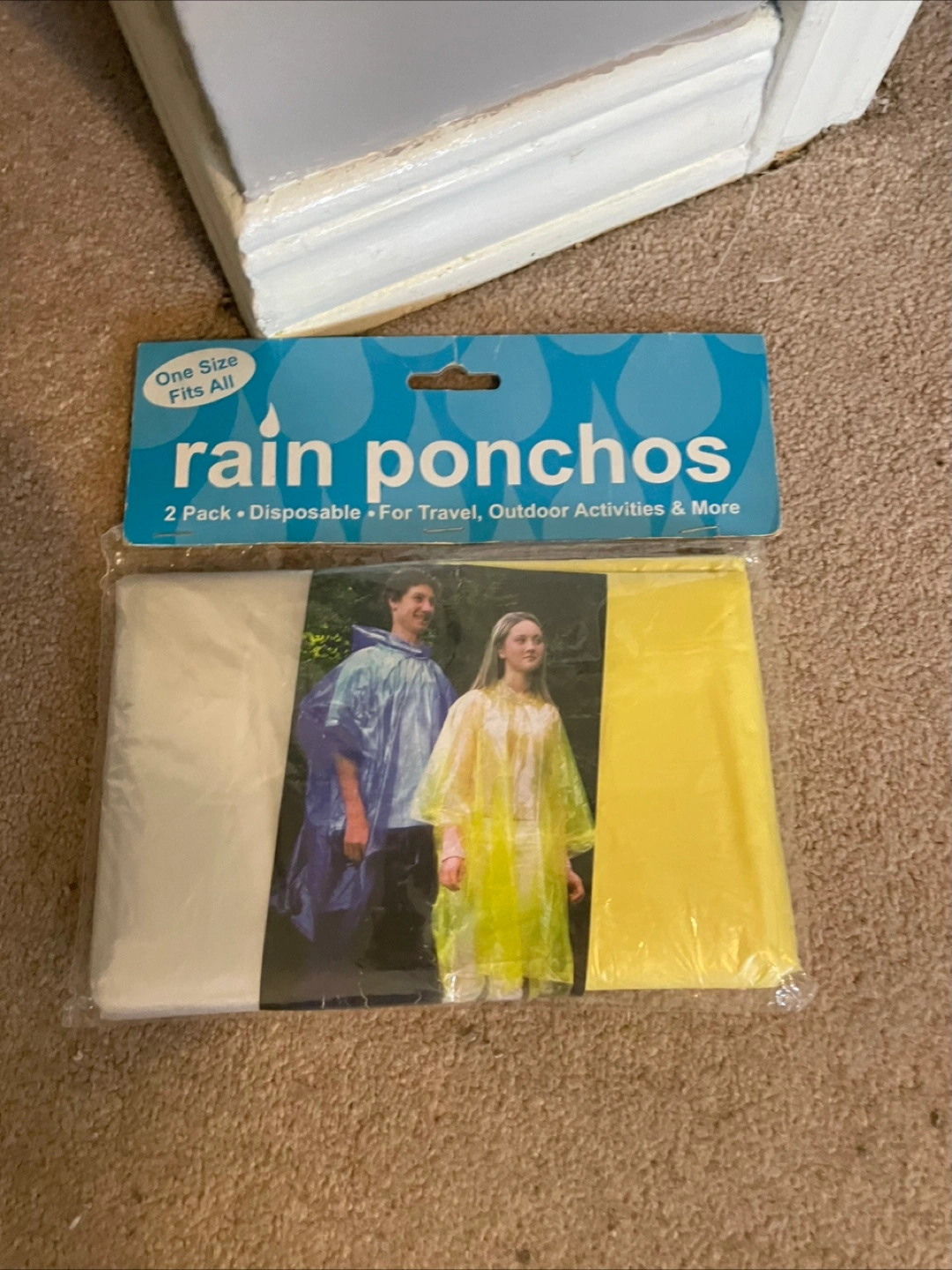 To give- 2-pack of disposable rain ponchos, perfect for travel and outdoor activities! These are one size fits all and are still sealed in the original packaging - never used.