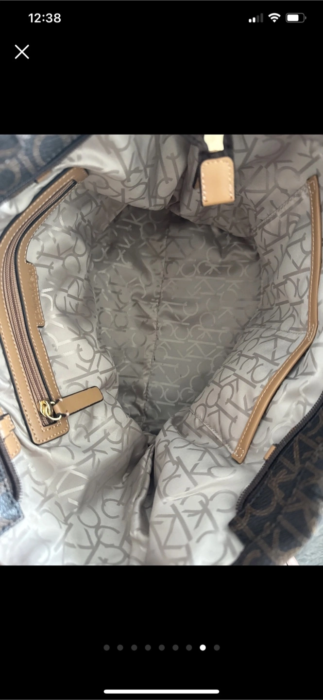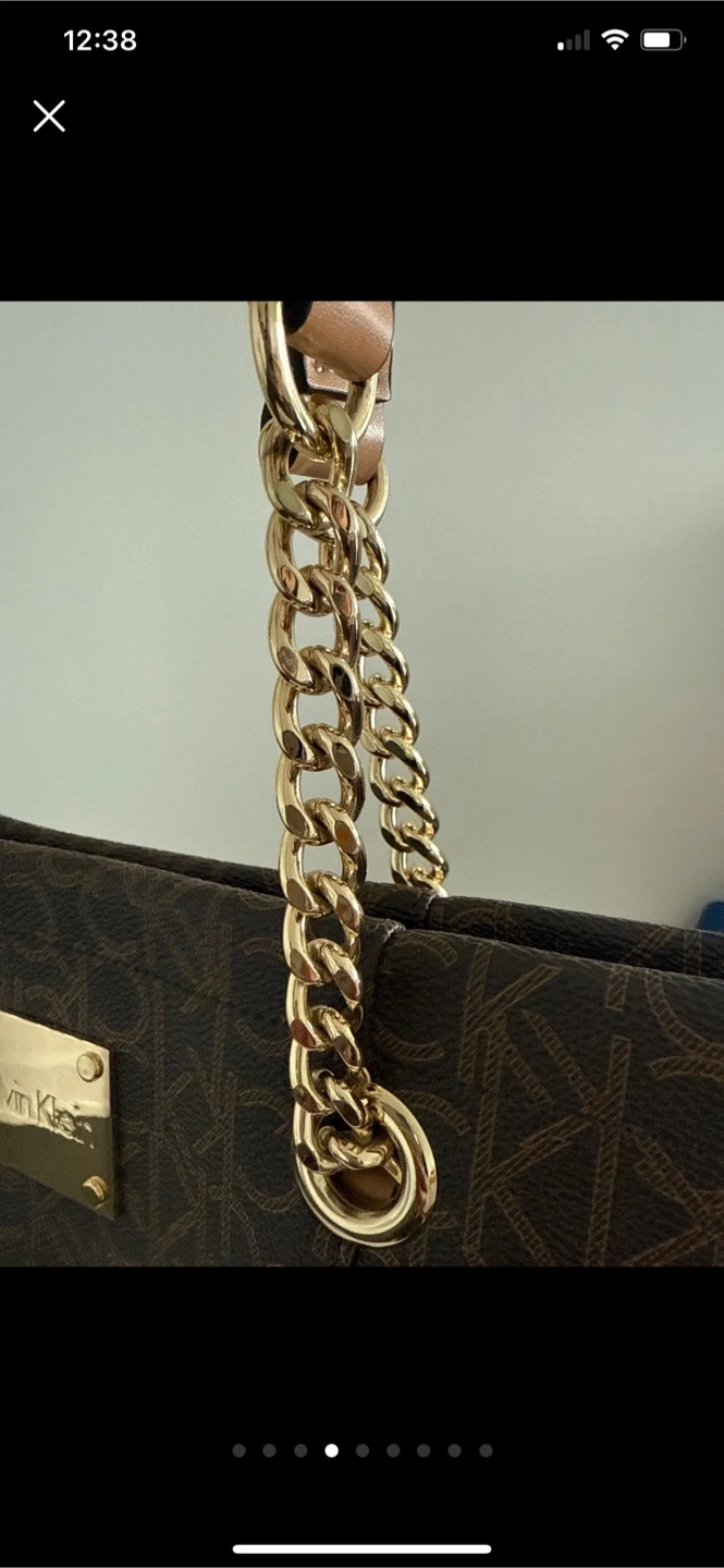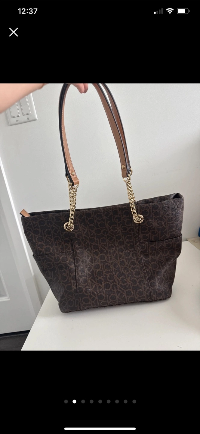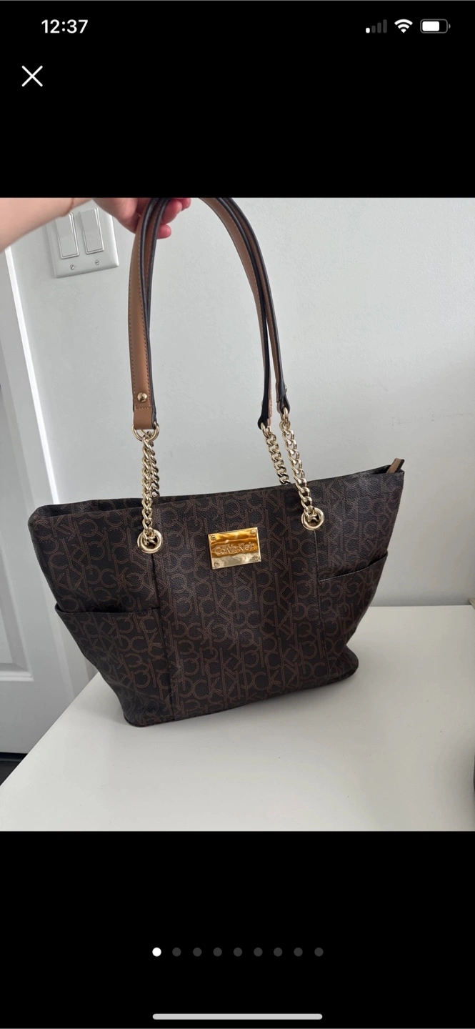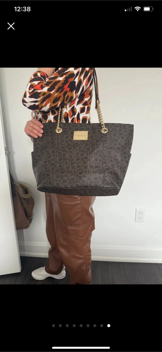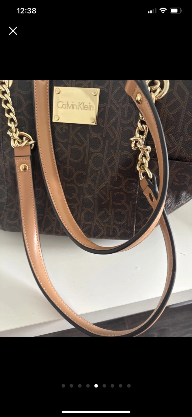 This is a stylish Calvin Klein tote bag in a brown monogram pattern. It features gold chain detailing on the straps. The interior is lined with a light grey fabric, also with the CK monogram. Perfect for everyday use! Like new used twice