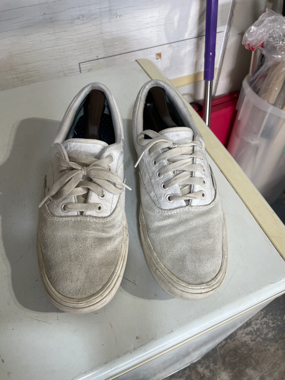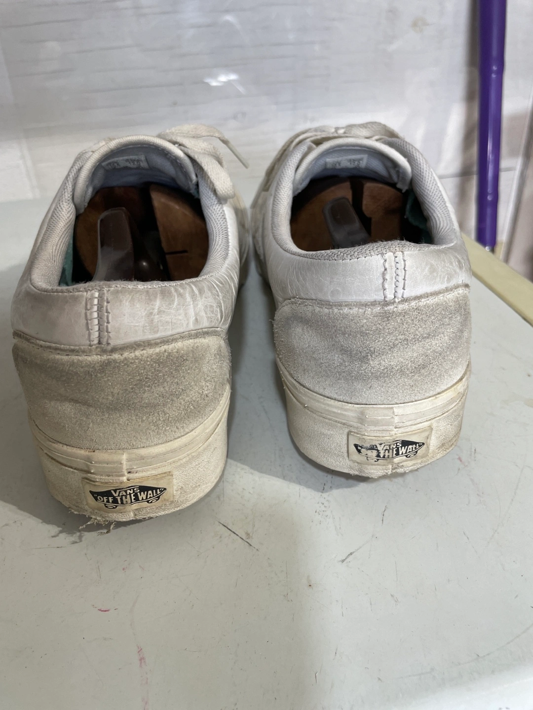 Selling a pair of Vans Off The Wall sneakers in white. They've been worn and show some signs of use, as you can see in the photos. Still lots of life left in them! Just need a wash bath.