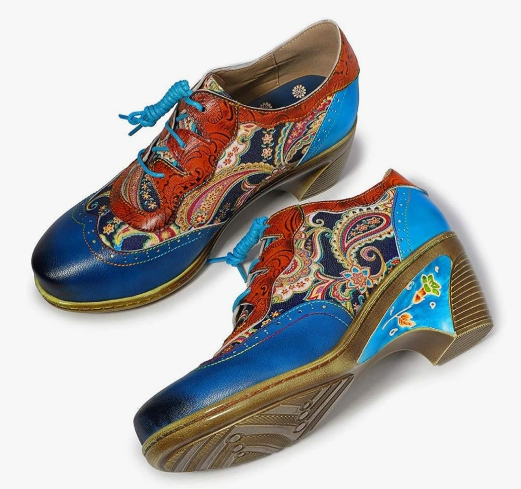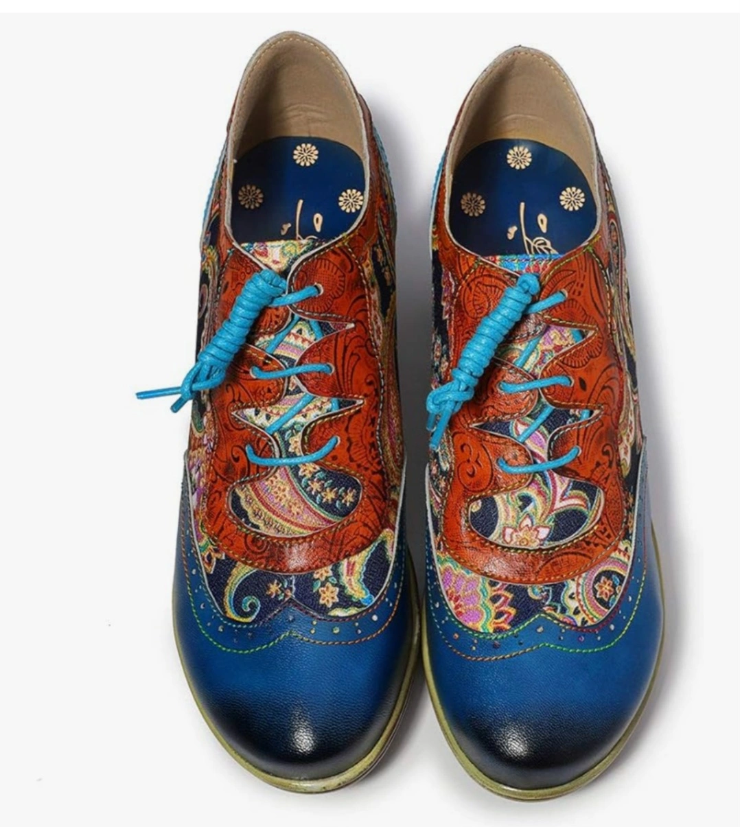 530These brand new CrazycatZ Lace-up Wingtip Multicolor Leather Oxfords Shoes are a unique addition to any wardrobe! The vibrant blue and orange paisley design is sure to turn heads. They are a women's size 10. These shoes are perfect for adding a pop of colour and personality to your outfit!