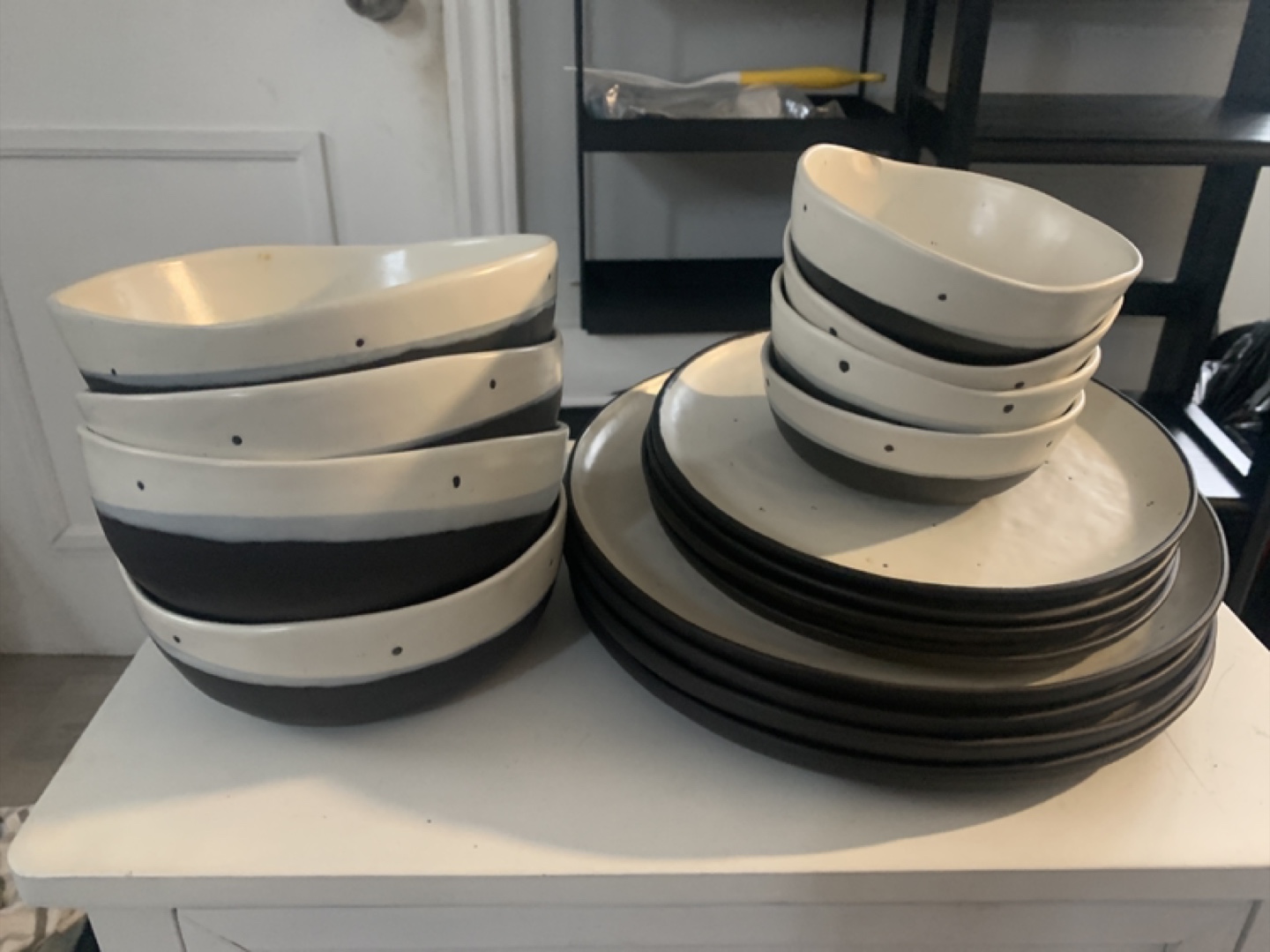 NEW GIBSON HOME ceramic dish set that includes 4 mini bowls, 4 medium bowls, 4 medium plates, 4 large plates. They have a nice two-tone design with a navy base and a cream interior. Gorgeous speckled print.