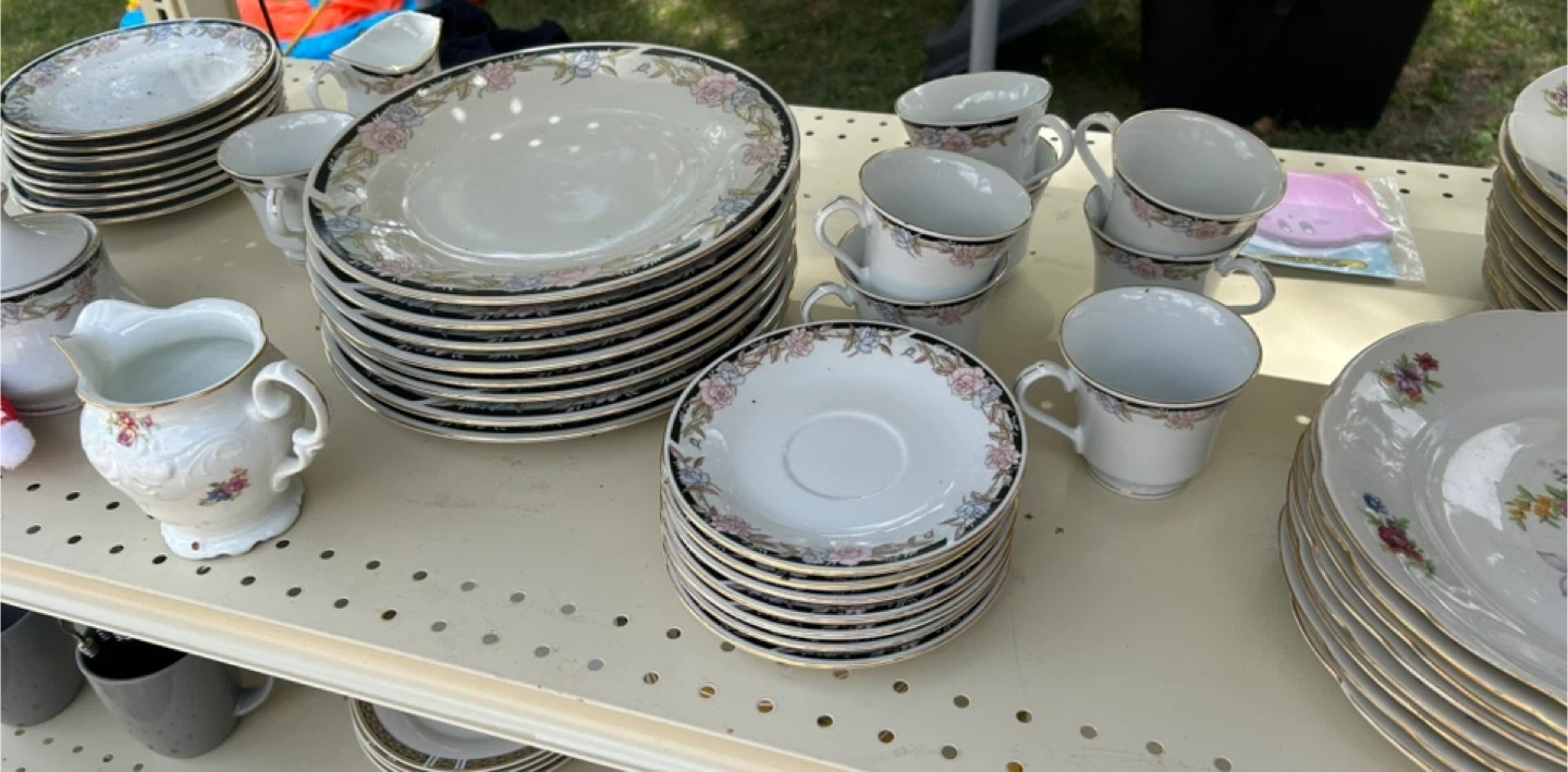 Selling a lovely china set with a delicate floral design! It includes plates, saucers, cups, and a creamer. Perfect for adding a touch of elegance to your dining experience or for special occasions. The set is in great condition and ready to be enjoyed!