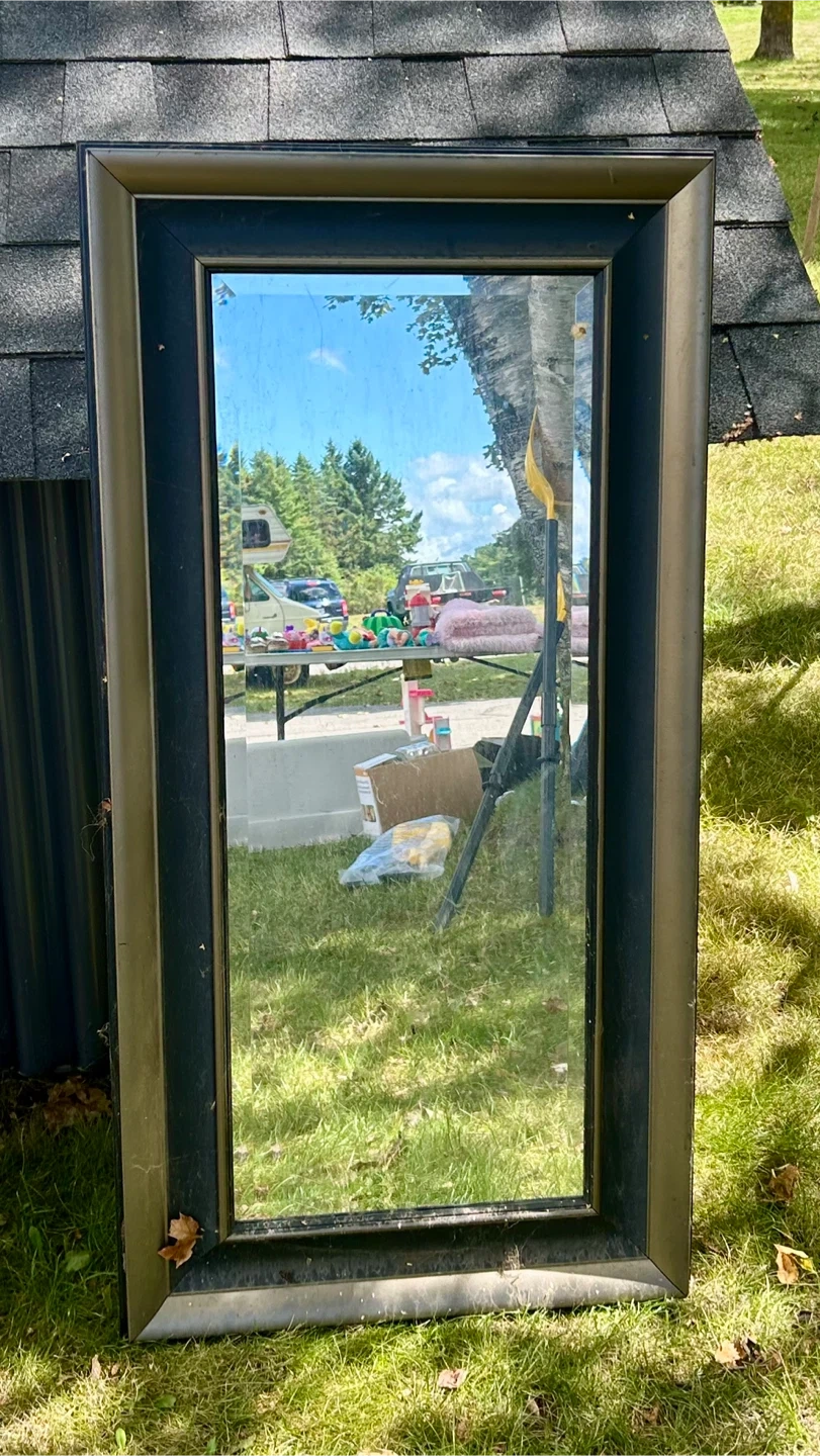Selling a framed mirror in good condition. It has a black and gold frame. Perfect for adding a touch of elegance to any room!