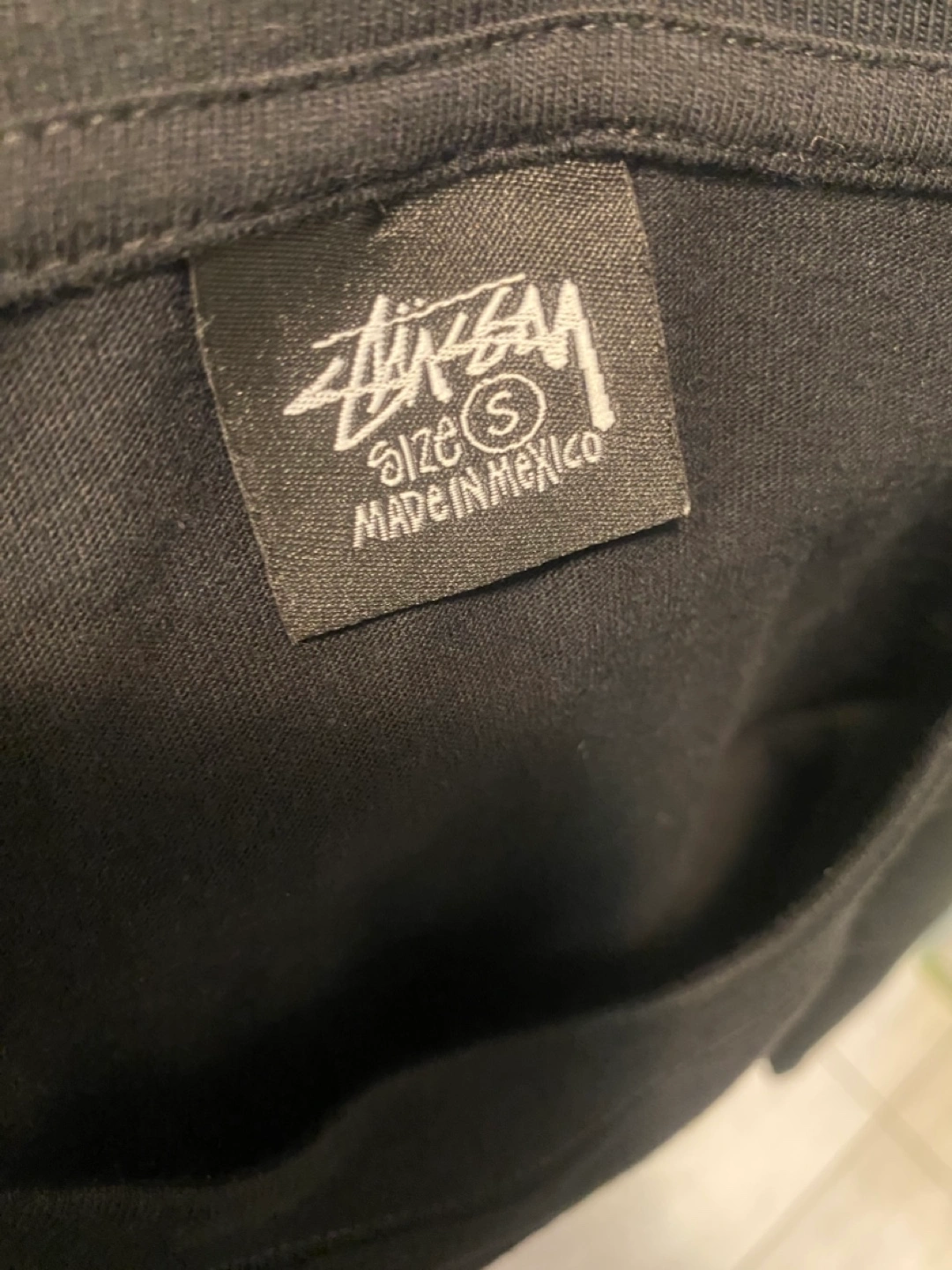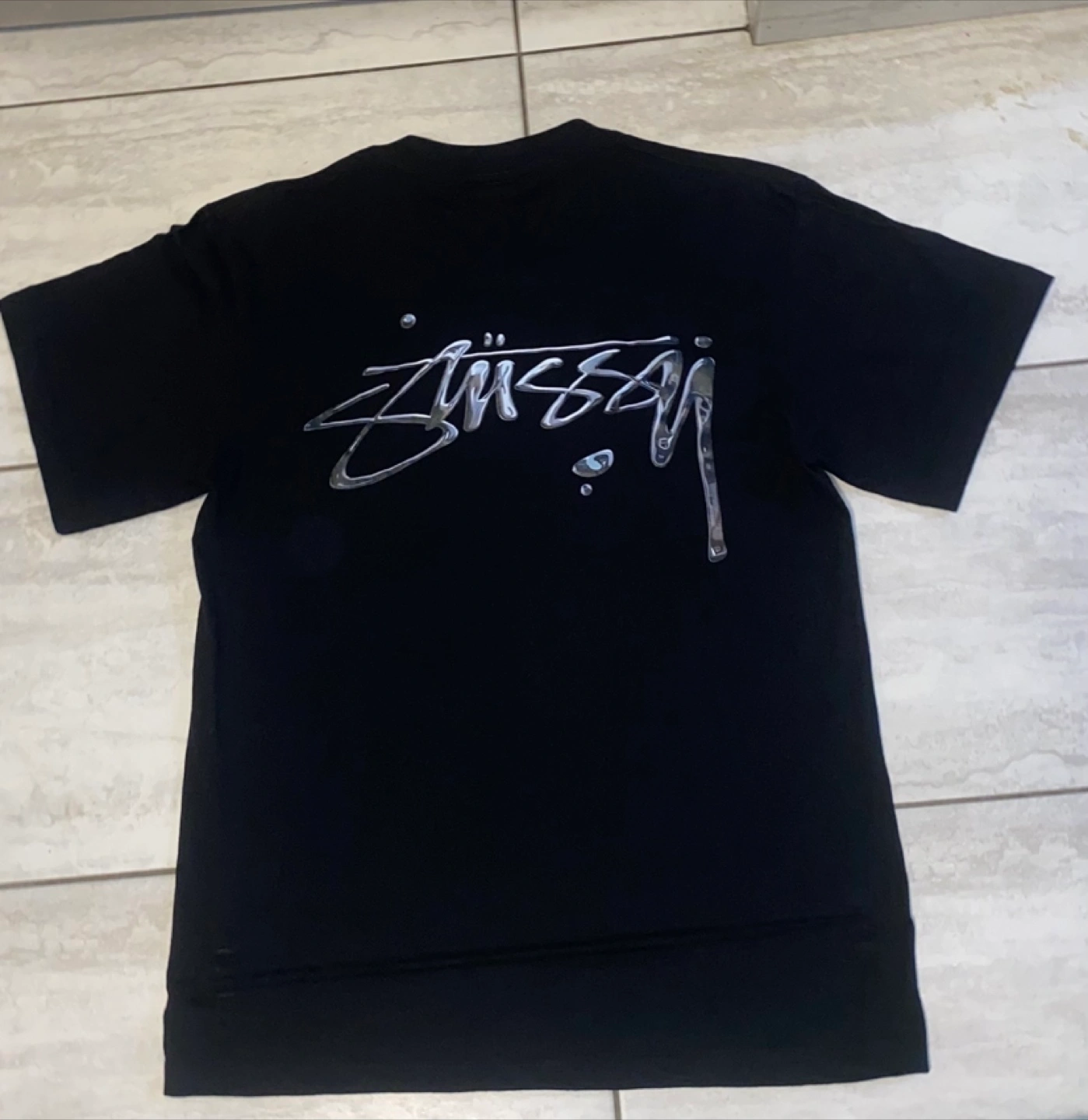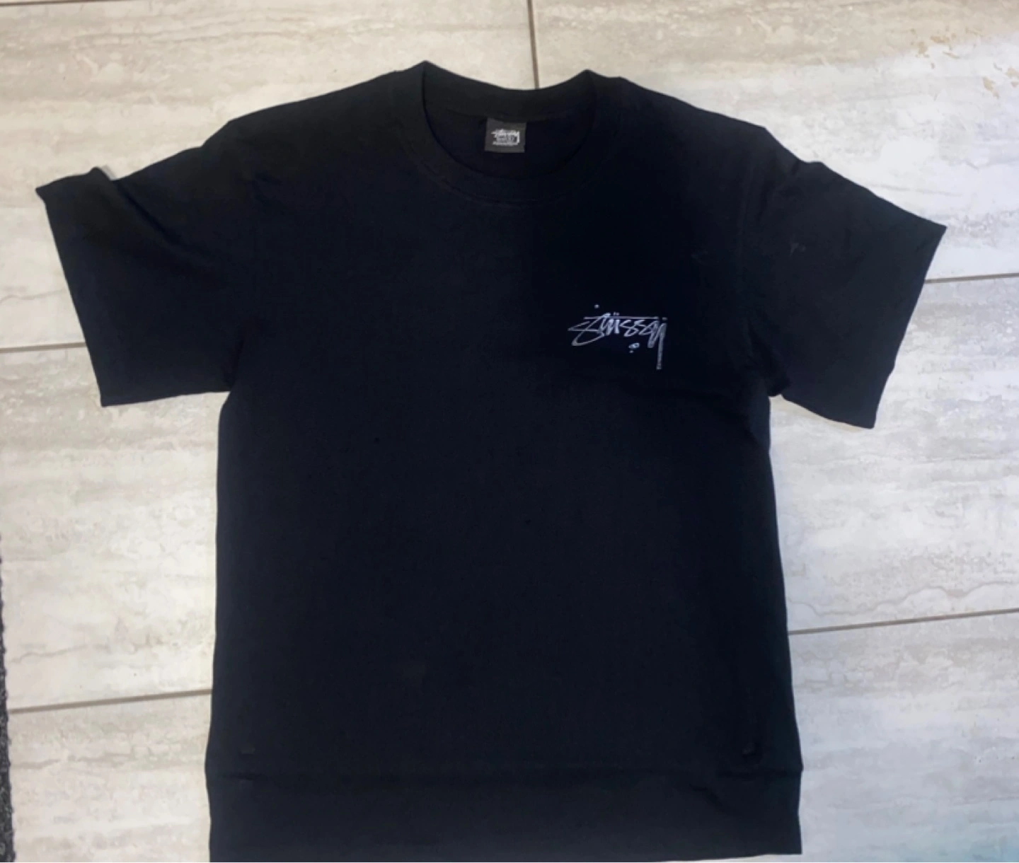 A black Stussy t-shirt in size small. It features the classic Stussy logo on the front and back. Great for casual wear!