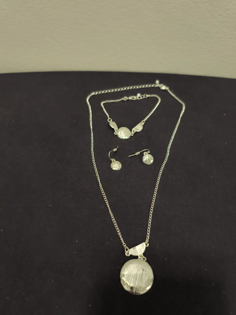 Selling a lovely silver-toned jewelry set! It includes a necklace, a bracelet, and a pair of earrings. They are in great condition and would make a wonderful addition to any jewelry collection