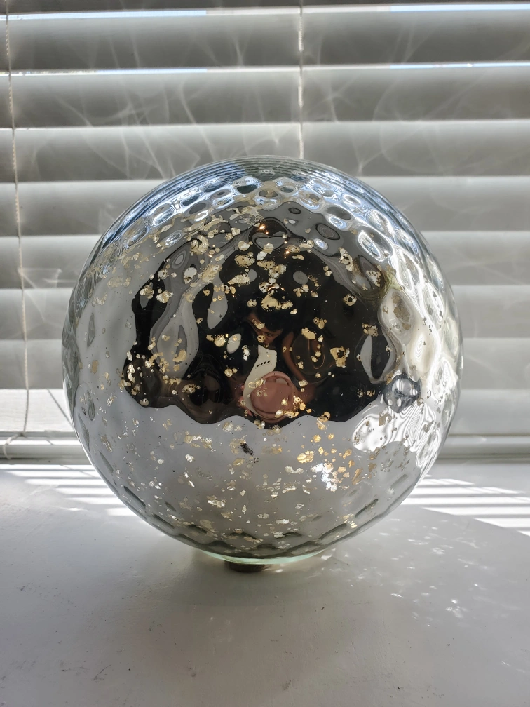 This is a beautiful silver decorative glass ball that will add a touch of elegance to any room. It has a unique hammered texture and gold flecks for added visual interest. It's in great condition and ready to find a new home!