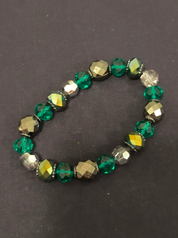 Selling a beaded stretch bracelet! It features alternating green and silver coloured beads. A simple and cute accessory to add to your collection