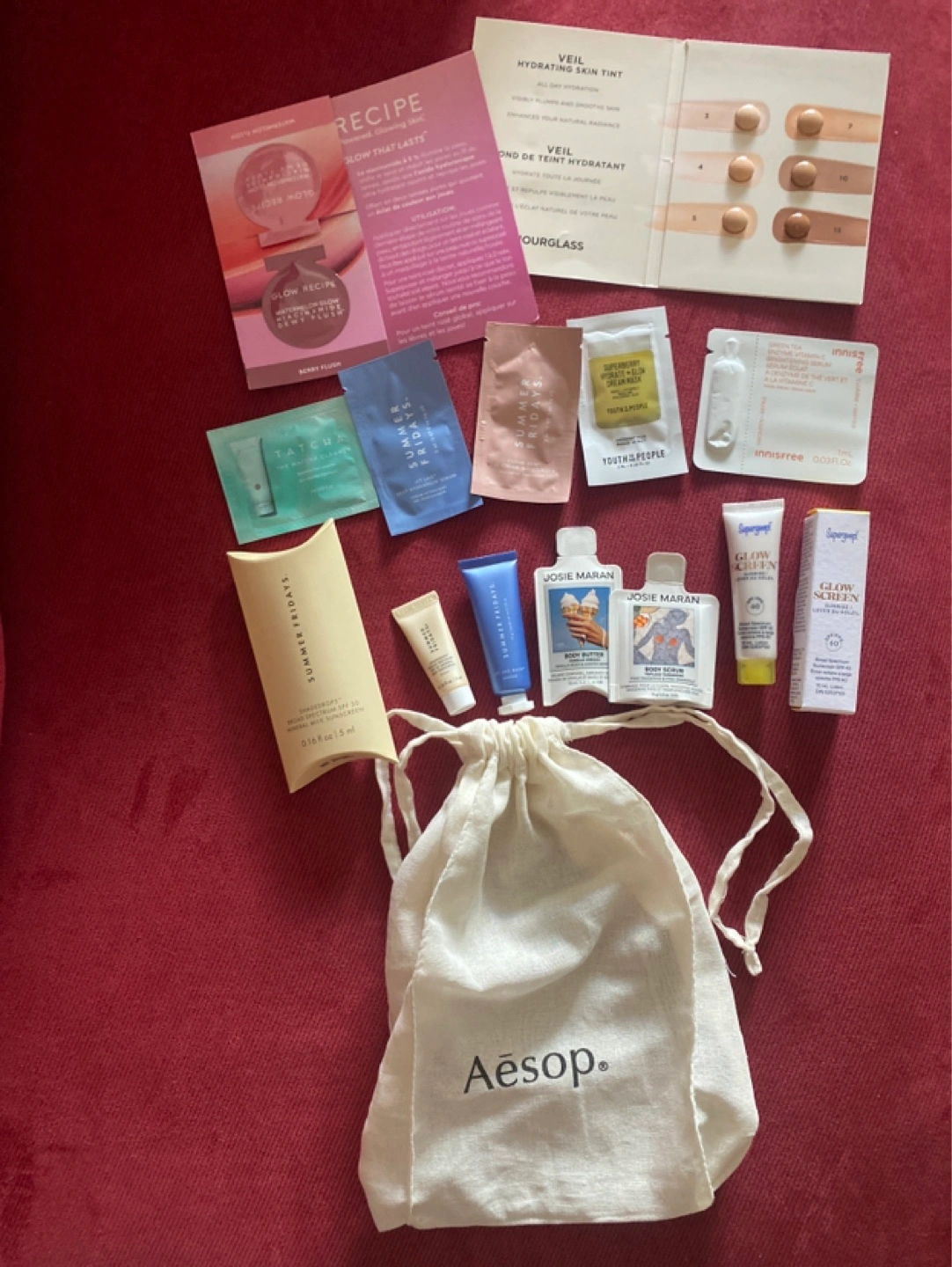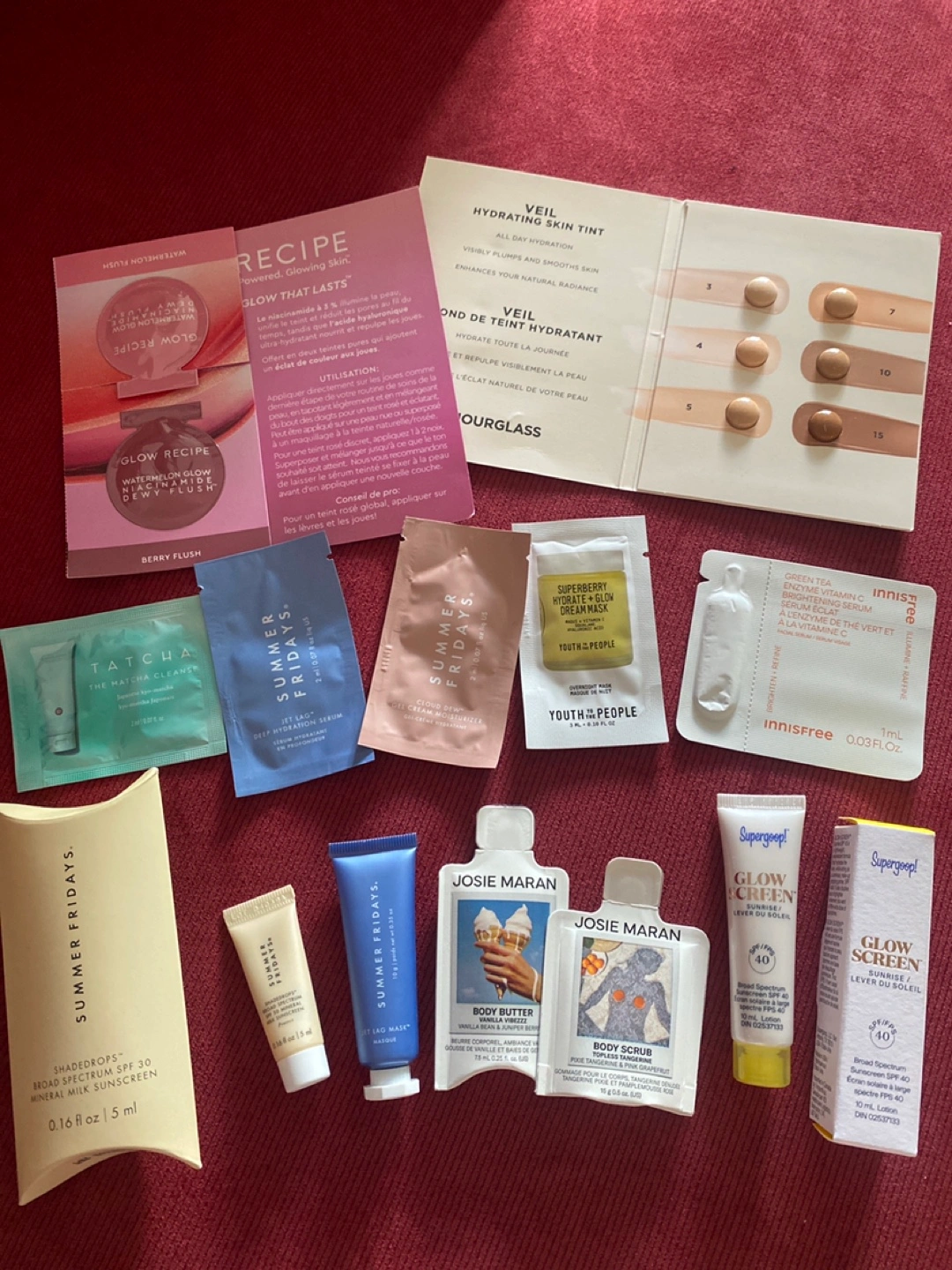 A collection of various beauty and skincare samples. Includes brands like Glow Recipe, Hourglass, Tatcha, Summer Fridays, Youth To The People, Innisfree, Josie Maran, and Supergoop! Perfect for trying out new products before committing to the full size. Feel free to reach out!