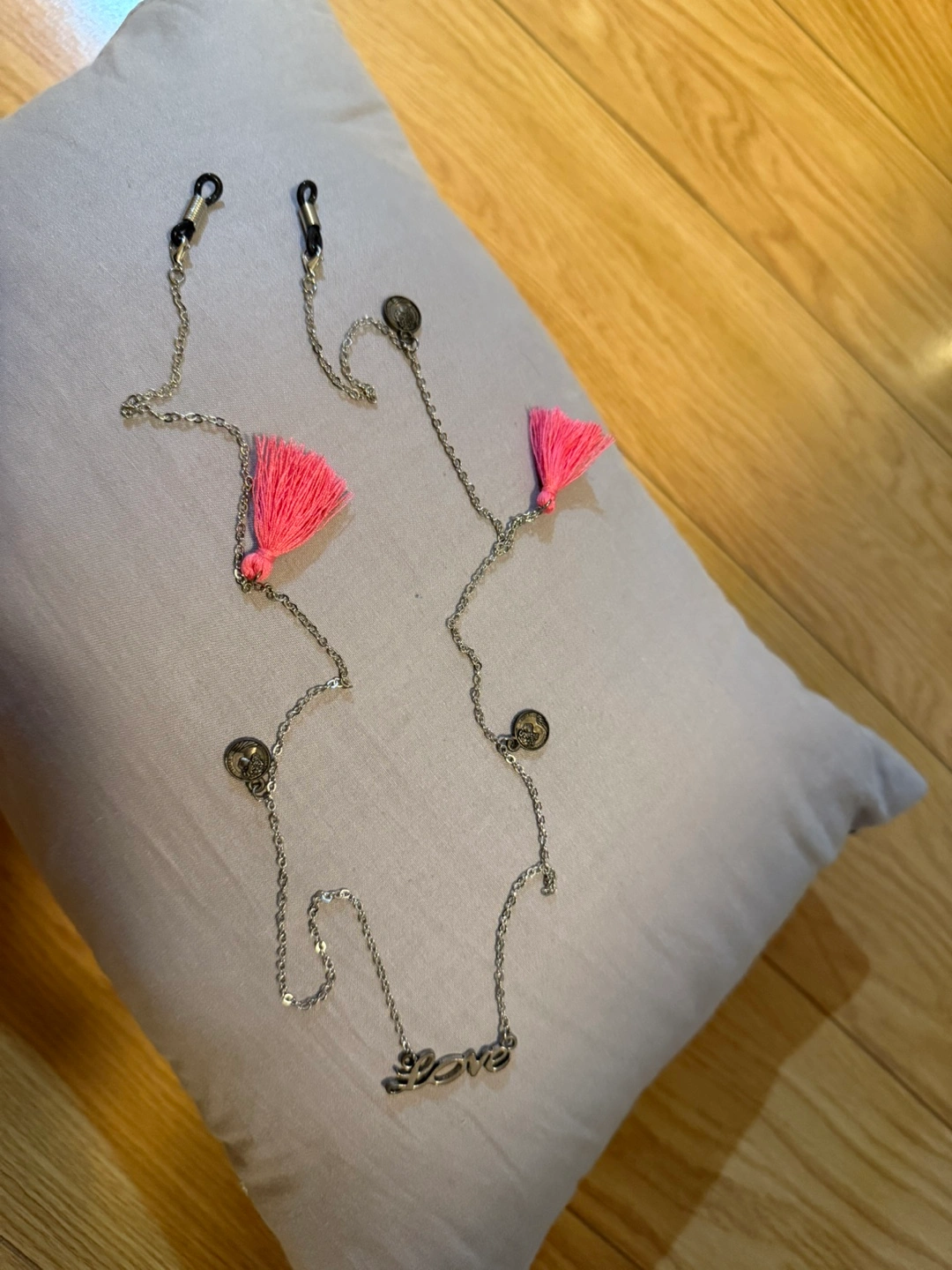 This is a silver-coloured glasses chain. It has pink tassels and little silver coins. The word 'love' is written at the bottom of the chain. Perfect condition barely used.