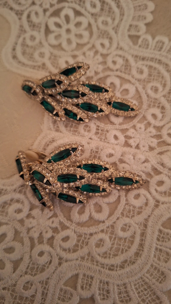 These are a pair of clip-on earrings with emerald green and clear rhinestones. They have a leaf-like design