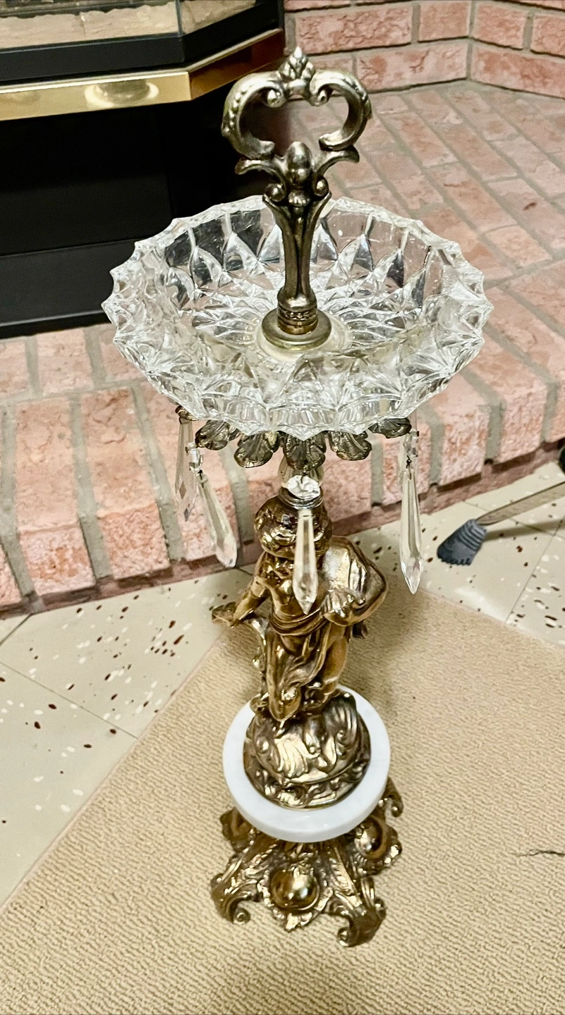 Preloved vintage crystal ashtray with crystal prism drops featuring a cherub design and marble on base. Intricate details. 28โ tall. Well-cared for and in excellent condition from European home.
