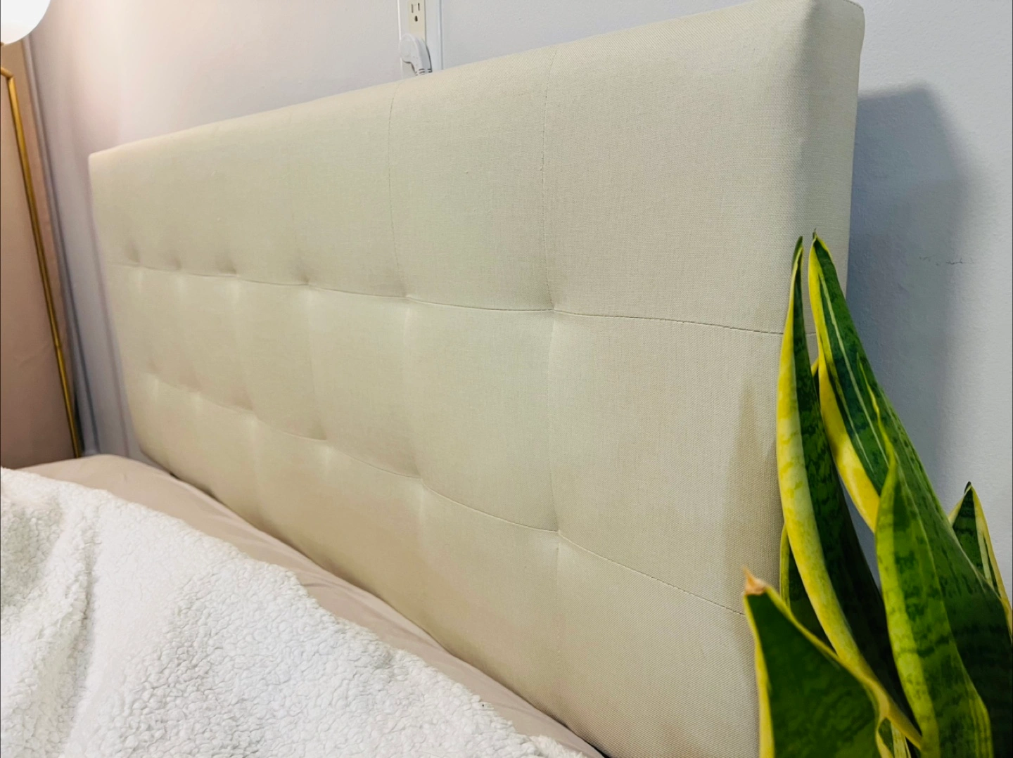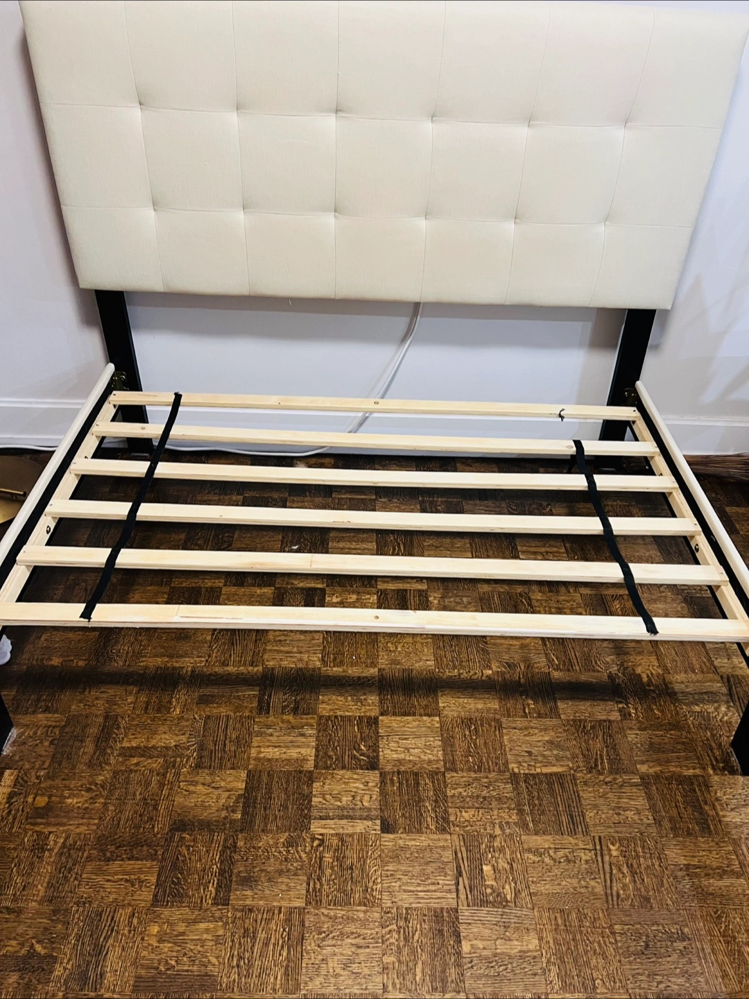 Selling a wooden bed frame with beige upholstered headboard with all the screws and a FREE hex key for easy installation.