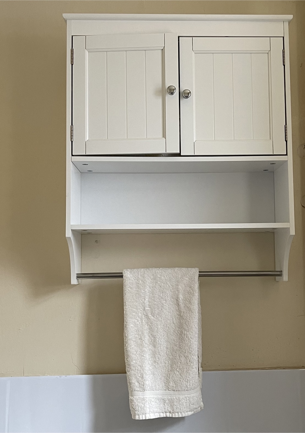 Wall-mounted bathroom cabinet in white. It features one adjustable shelf and a towel bar, perfect for bathroom or living room storage.