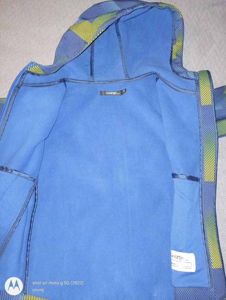 This is a blue patterned hooded jacket from George. It features a cool design with blue and yellow colours. Perfect for keeping your little one warm and stylish!