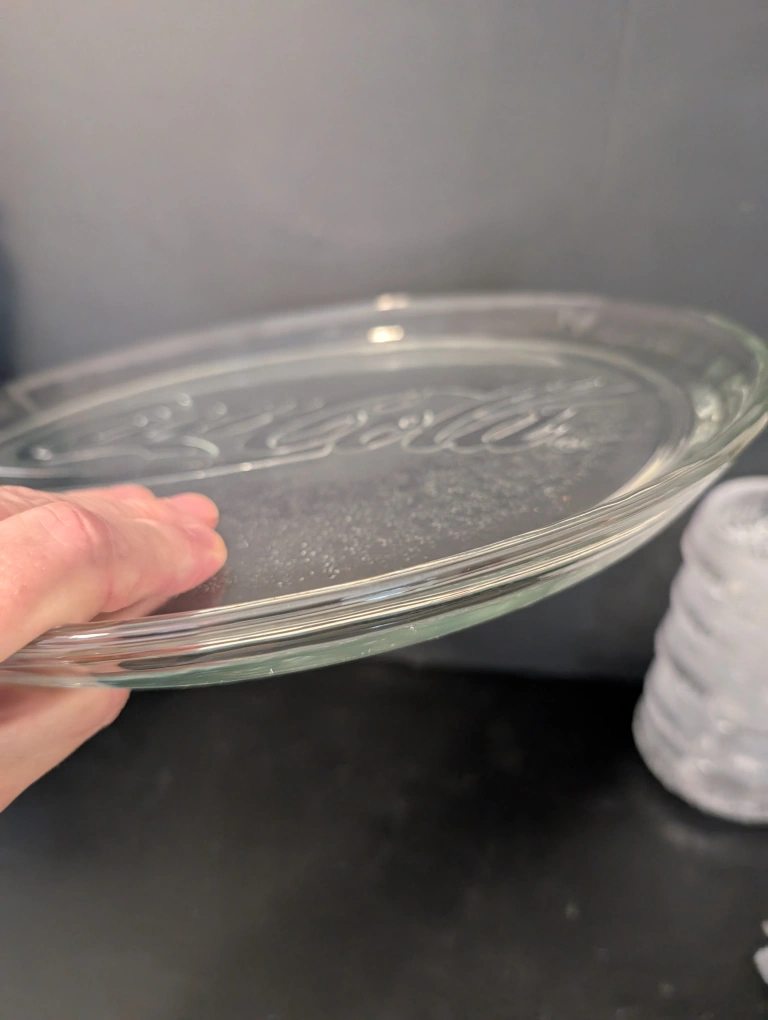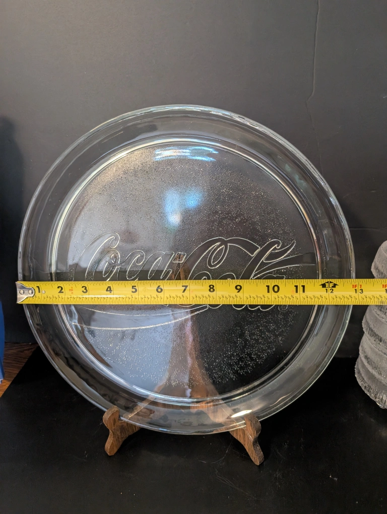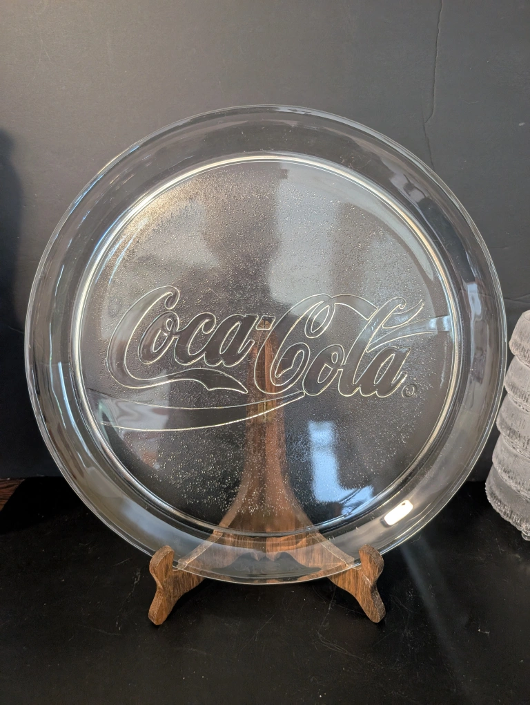 Selling a clear glass serving tray featuring the Coca-Cola logo. It's in good condition and perfect for adding a vintage touch to your kitchen or for serving up some snacks.