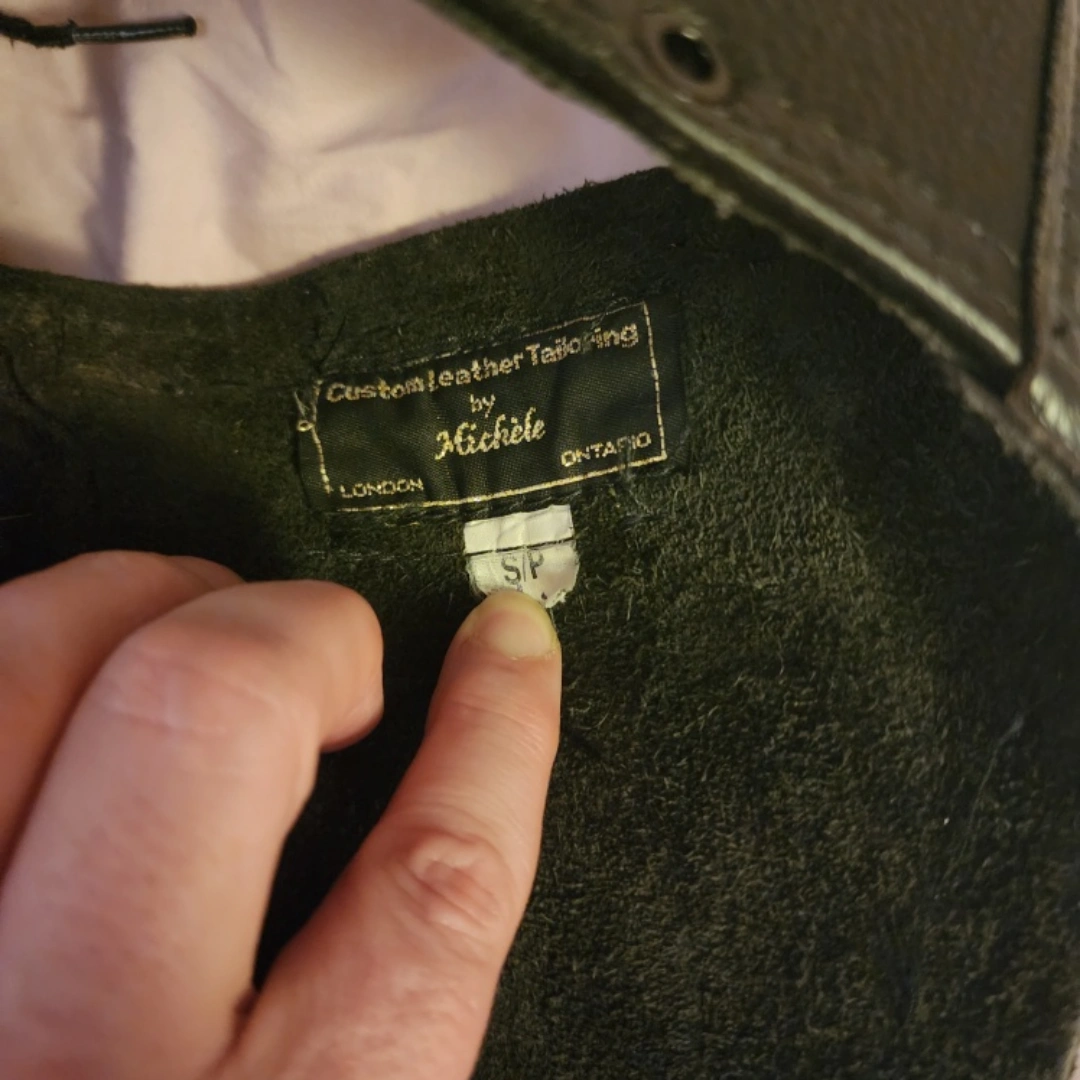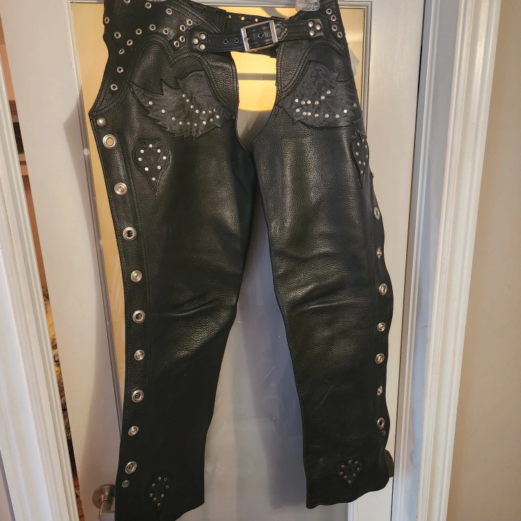 Selling a pair of vintage custom leather motorcycle chaps. They feature a black leather design with decorative rivets and embellishments. Solid zipper side closures and belt buckle / adjustable waist band. 34 inch waist fully adjustable to 38. 40 inch long leg . Customized by a leather designer in 2005. Originally purchased from Michelle custom leather in London Ontario in the 80s.
