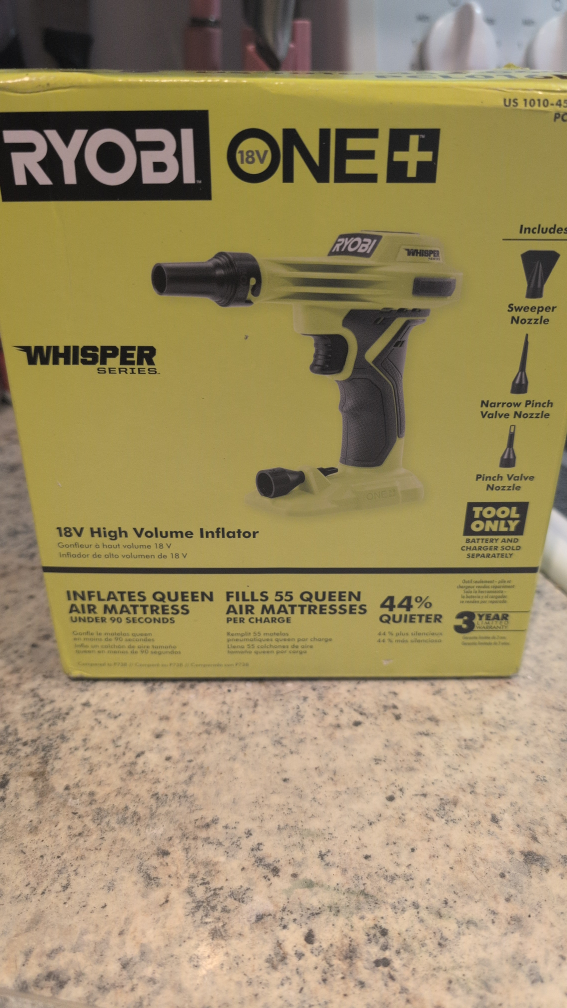 Selling a Ryobi ONE+ 18V High Volume Inflator from the Whisper Series! This tool inflates queen air mattresses in under 90 seconds and can fill up to 55 queen air mattresses per charge. It also comes with a sweeper nozzle, narrow pinch valve nozzle, and pinch valve nozzle. Note that this is a tool only; the battery and charger are sold separately