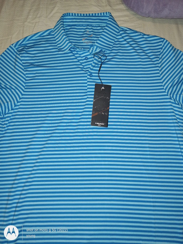 Looking to sell this HEAD golf polo shirt. It's a stylish blue striped design, perfect for a day on the green or casual wear. The material is lightweight and breathable, making it super comfy for warm weather. Great condition, ready for a new home!